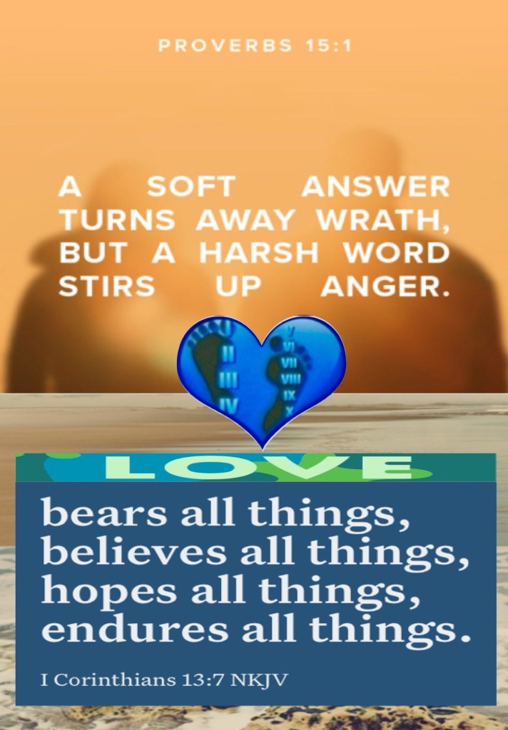 Today’s lesson Joshua 8/ 24, today’s verses: “A soft answer turns away wrath, But a harsh word stirs up anger.” Proverbs 15:1 “bears all things, believes all things, hopes all things, endures all things.” I Corinthians 13:7