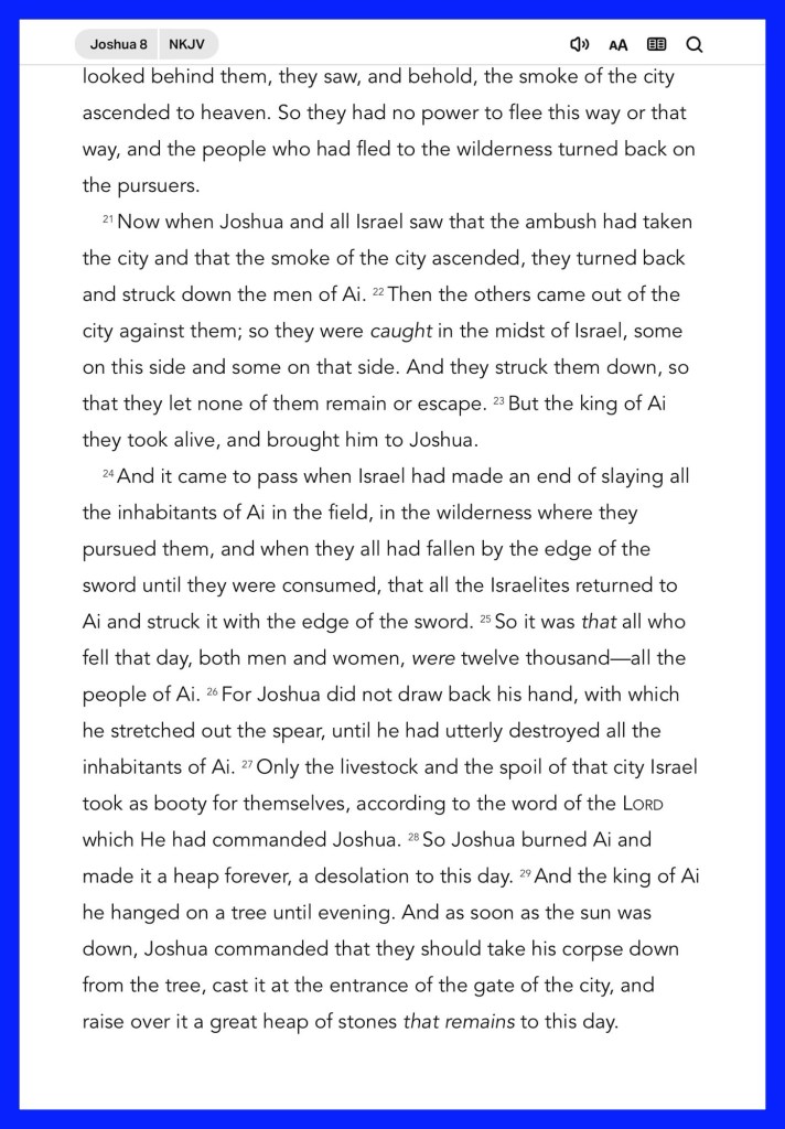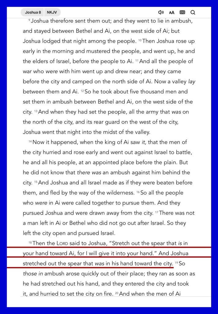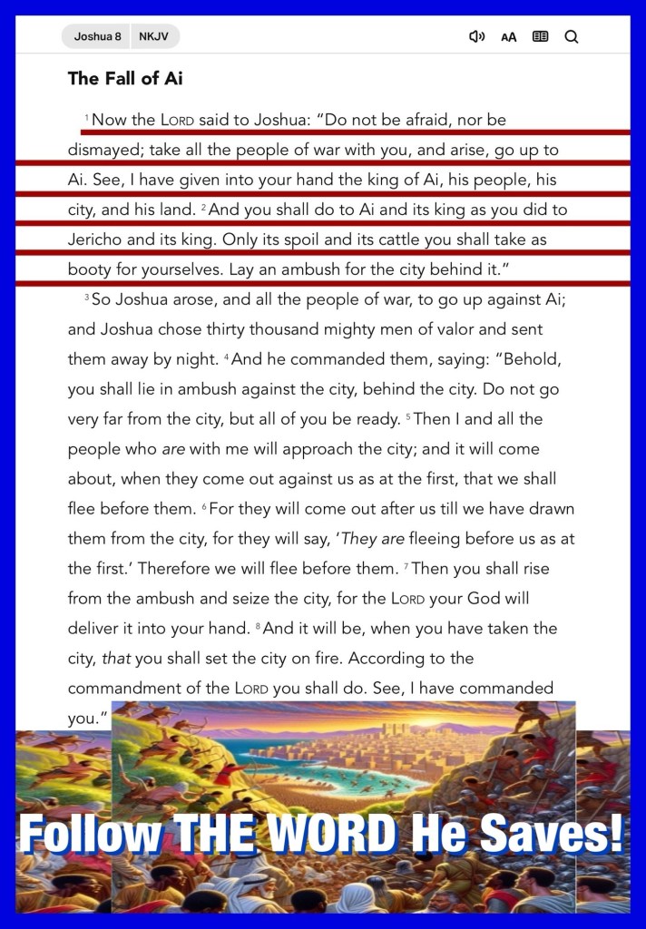“Now the Lord said to Joshua: “Do not be afraid, nor be dismayed; take all the people of war with you, and arise, go up to Ai. See, I have given into your hand the king of Ai, his people, his city, and his land. And you shall do to Ai and its king as you did to Jericho and its king. Only its spoil and its cattle you shall take as booty for yourselves. Lay an ambush for the city behind it.” Then the Lord said to Joshua, “Stretch out the spear that is in your hand toward Ai, for I will give it into your hand.” And Joshua stretched out the spear that was in his hand toward the city.” Joshua 8:1-2, 18