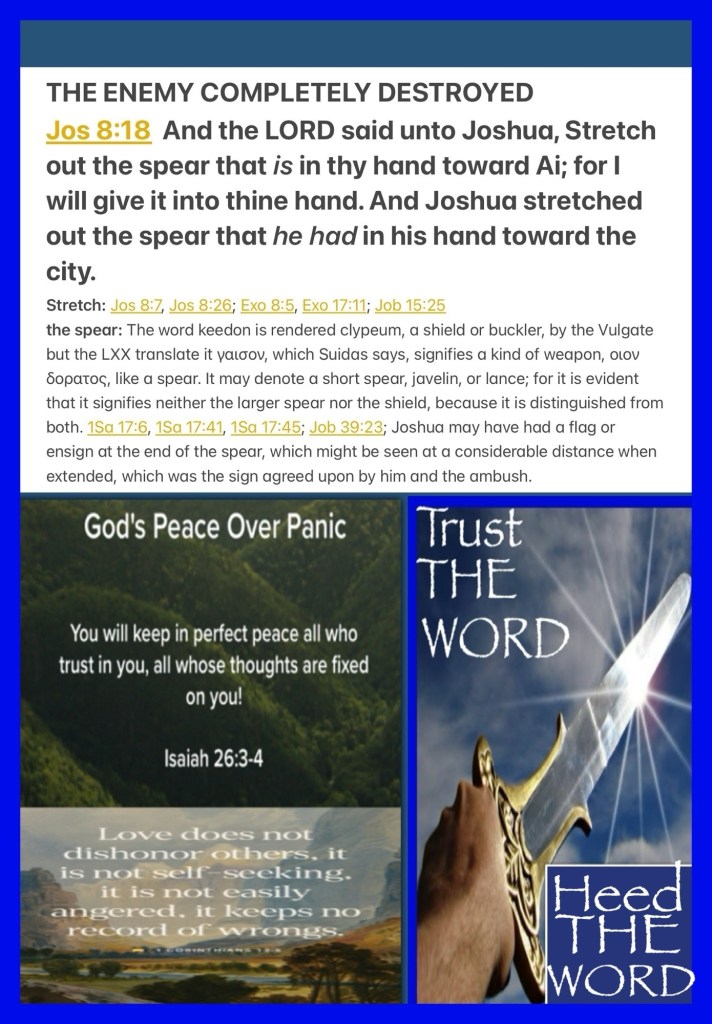Greetings BeLoved child of THE MOST HIGH GOD THE CREATOR THE COMMANDER LOVE ITSELF So When YAH Says Fight: Stretch Out Your Spear; spiritual warfare is always in play our DELIVERANCE Is In JESUS CHRIST. Have a blessed and beautiful week BeLoved. Please enjoy this study remember your Spear: your SWORD Is THE WORD OF YAH Stay In His WORD Live In His LOVE!