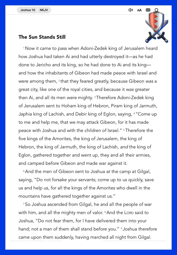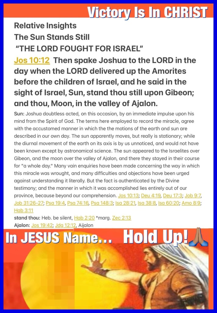 “Then Joshua spoke to the Lord in the day when the Lord delivered up the Amorites before the children of Israel, and he said in the sight of Israel: “Sun, stand still over Gibeon; And Moon, in the Valley of Aijalon.” So the sun stood still, And the moon stopped, Till the people had revenge Upon their enemies. Is this not written in the Book of Jasher? So the sun stood still in the midst of heaven, and did not hasten to go down for about a whole day. And there has been no day like that, before it or after it, that the Lord heeded the voice of a man; for the Lord fought for Israel.” Joshua 10:12-14