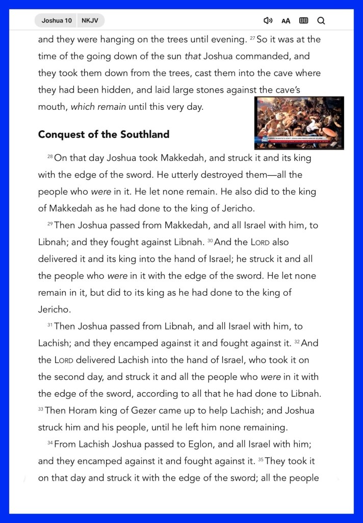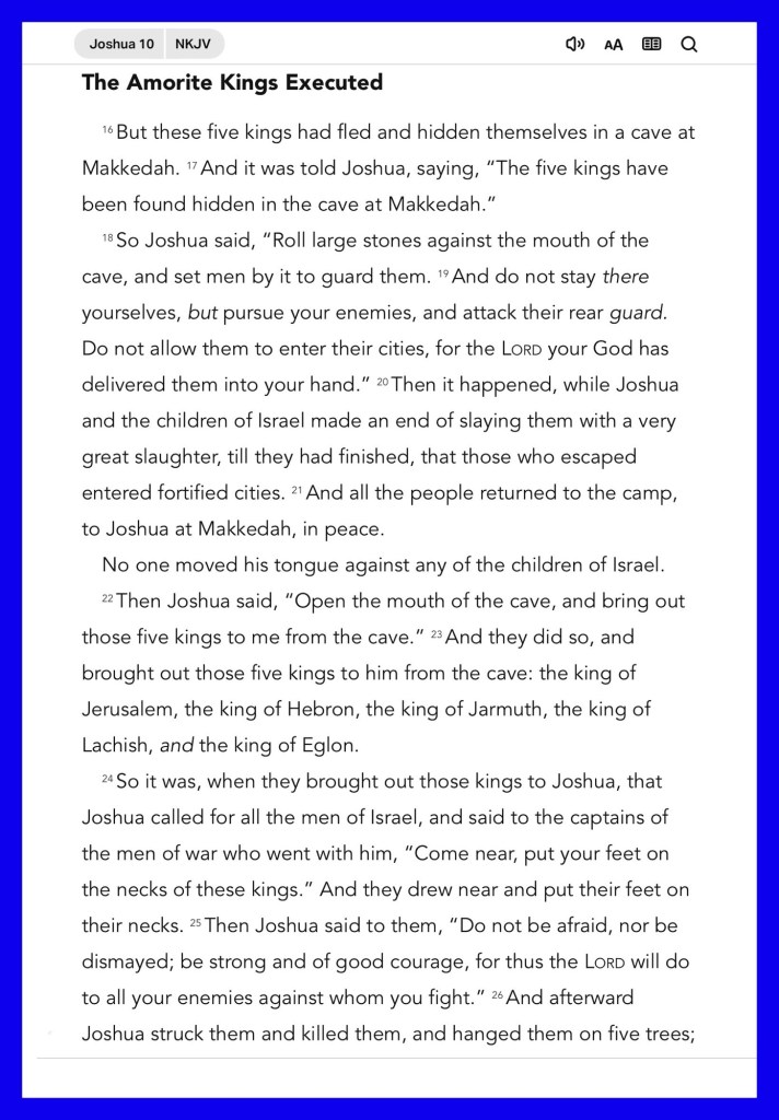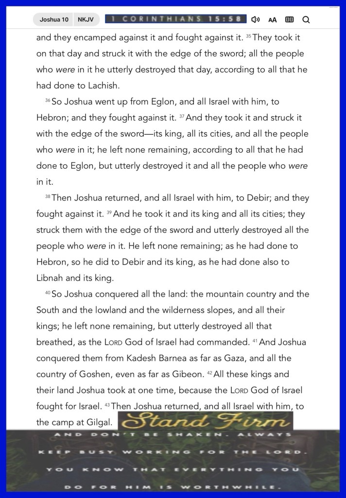 Today’s lesson Joshua 10/ 24, today’s verses: “You shall not take vengeance, nor bear any grudge against the children of your people, but you shall love your neighbor as yourself: I am the Lord.” Leviticus 19:18 “For “whoever calls on the name of the Lord shall be saved.”” Romans 10:13