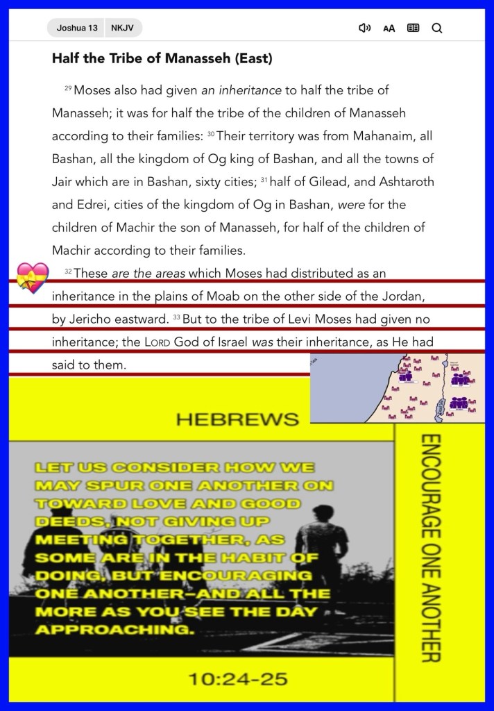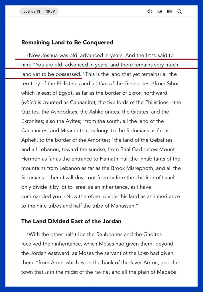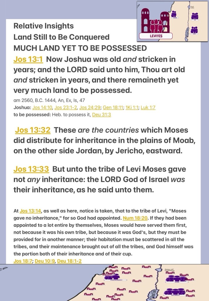βNow Joshua was old, advanced in years. And the Lord said to him: βYou are old, advanced in years, and there remains very much land yet to be possessed. These are the areas which Moses had distributed as an inheritance in the plains of Moab on the other side of the Jordan, by Jericho eastward. But to the tribe of Levi Moses had given no inheritance; the Lord God of Israel was their inheritance, as He had said to them.β Joshua 13:1, 32-33