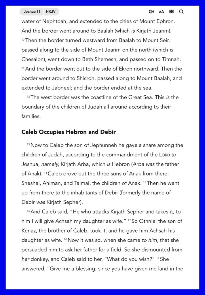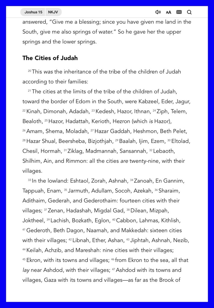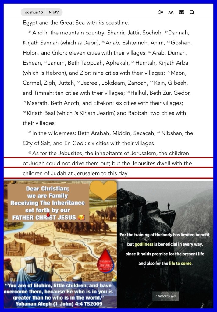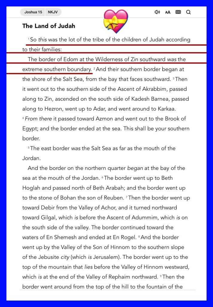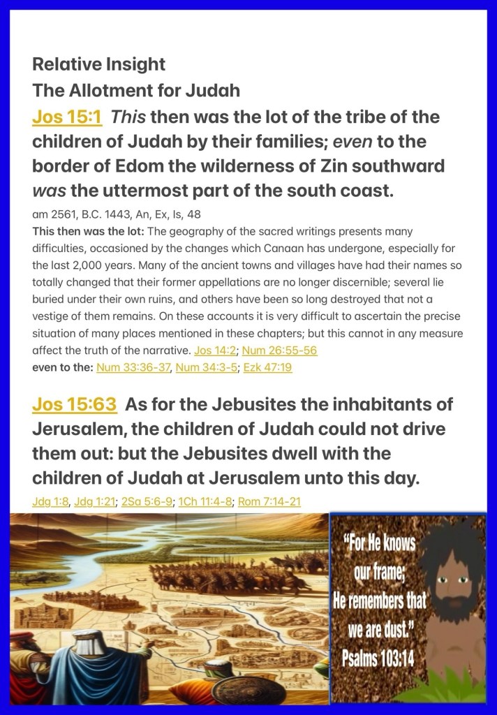 “So this was the lot of the tribe of the children of Judah according to their families: The border of Edom at the Wilderness of Zin southward was the extreme southern boundary. … As for the Jebusites, the inhabitants of Jerusalem, the children of Judah could not drive them out; but the Jebusites dwell with the children of Judah at Jerusalem to this day.” Joshua 15:1, 63