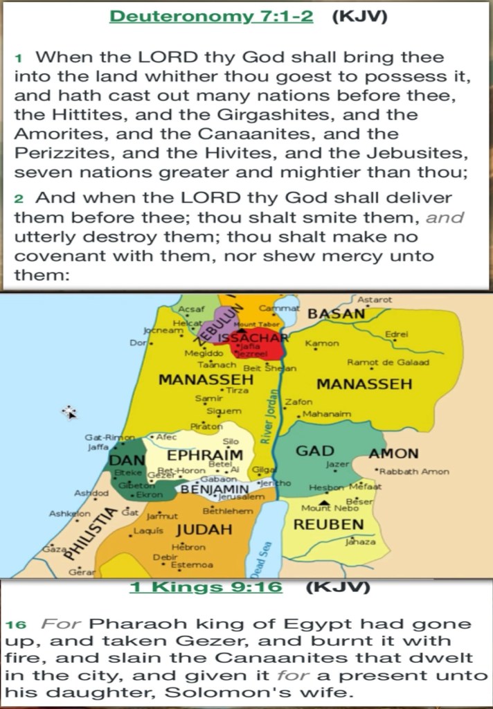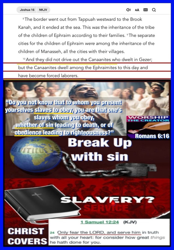 “So the children of Joseph, Manasseh and Ephraim, took their inheritance. … And they did not drive out the Canaanites who dwelt in Gezer; but the Canaanites dwell among the Ephraimites to this day and have become forced laborers.” Joshua 16:4, 10
