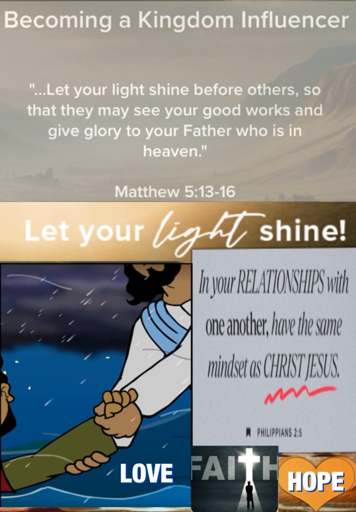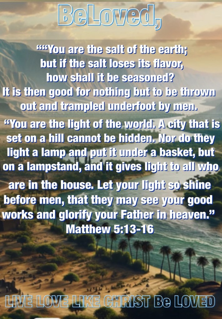 Today’s lesson Joshua 16/ 24, today’s verses: ““You are the salt of the earth; but if the salt loses its flavor, how shall it be seasoned? It is then good for nothing but to be thrown out and trampled underfoot by men. “You are the light of the world. A city that is set on a hill cannot be hidden. Nor do they light a lamp and put it under a basket, but on a lampstand, and it gives light to all who are in the house. Let your light so shine before men, that they may see your good works and glorify your Father in heaven.” Matthew 5:13-16 “Let this mind be in you which was also in Christ Jesus,” Philippians 2:5