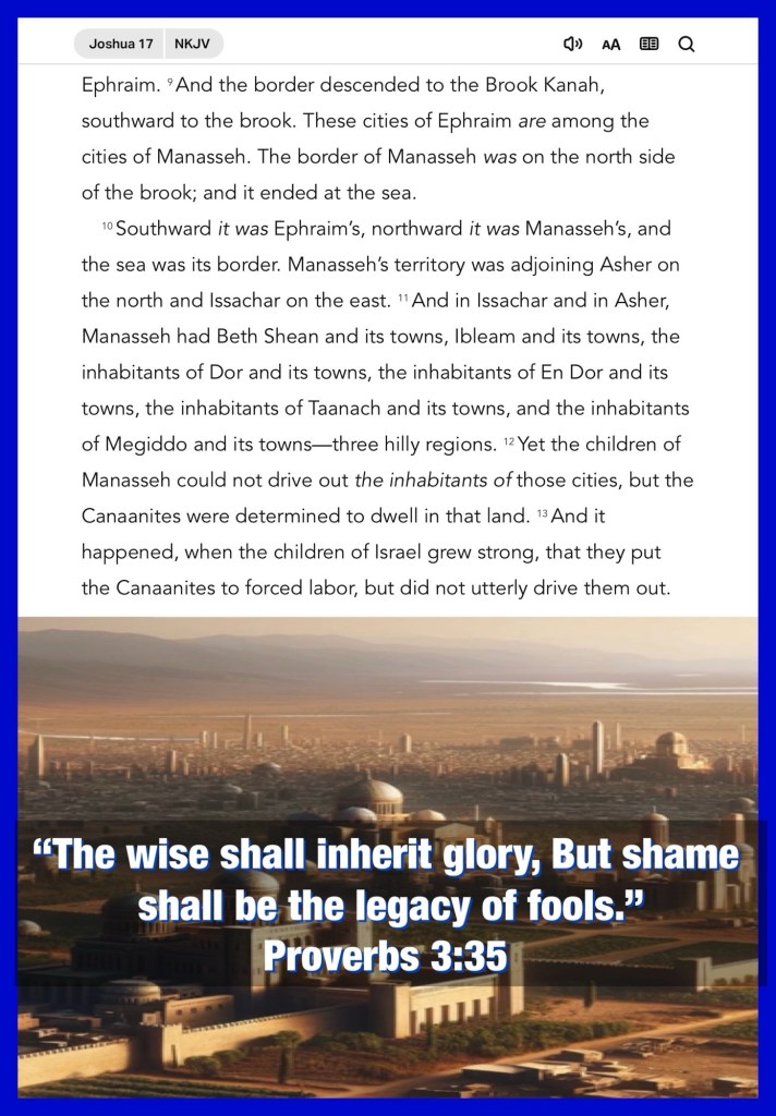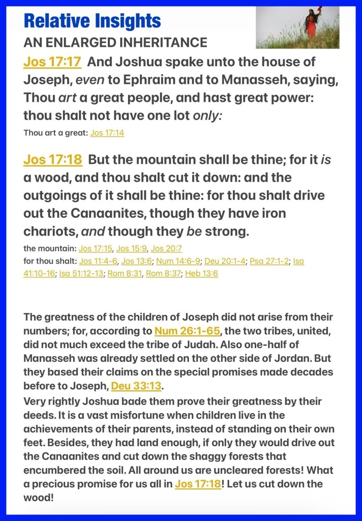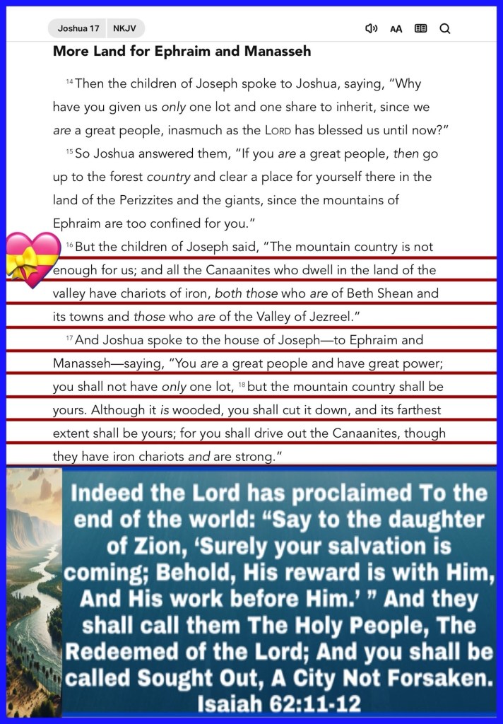 “And Joshua spoke to the house of Joseph—to Ephraim and Manasseh—saying, “You are a great people and have great power; you shall not have only one lot, but the mountain country shall be yours. Although it is wooded, you shall cut it down, and its farthest extent shall be yours; for you shall drive out the Canaanites, though they have iron chariots and are strong.”” Joshua 17:17-18