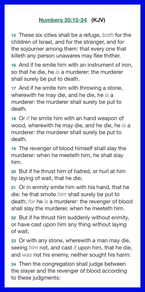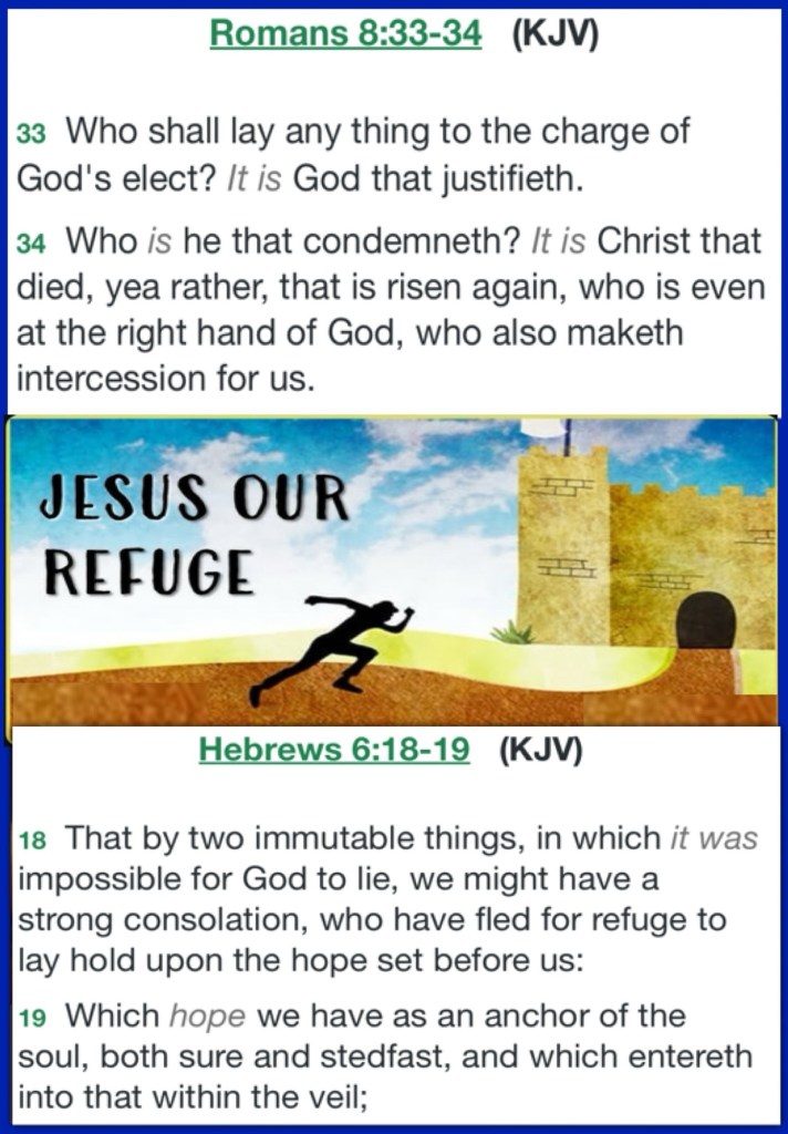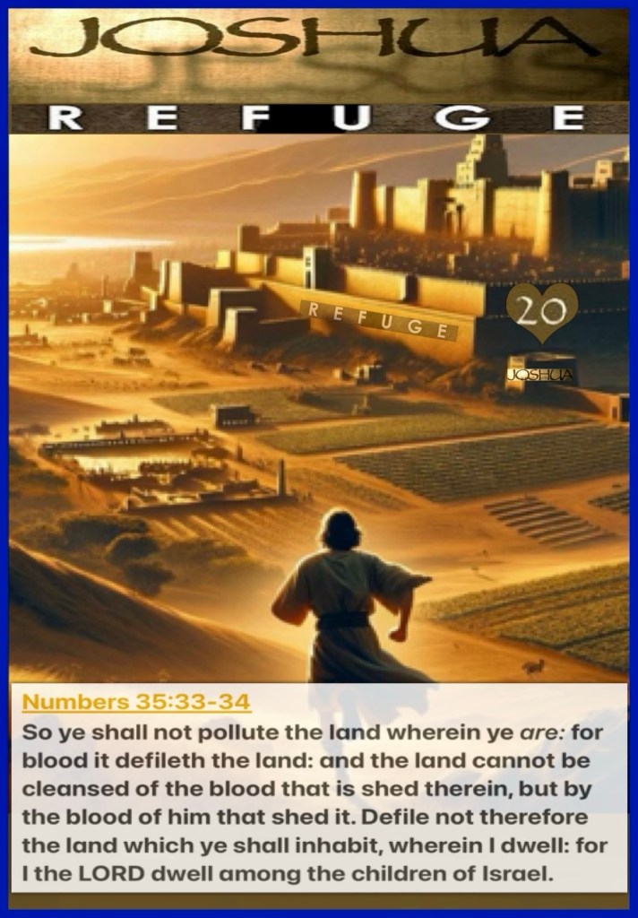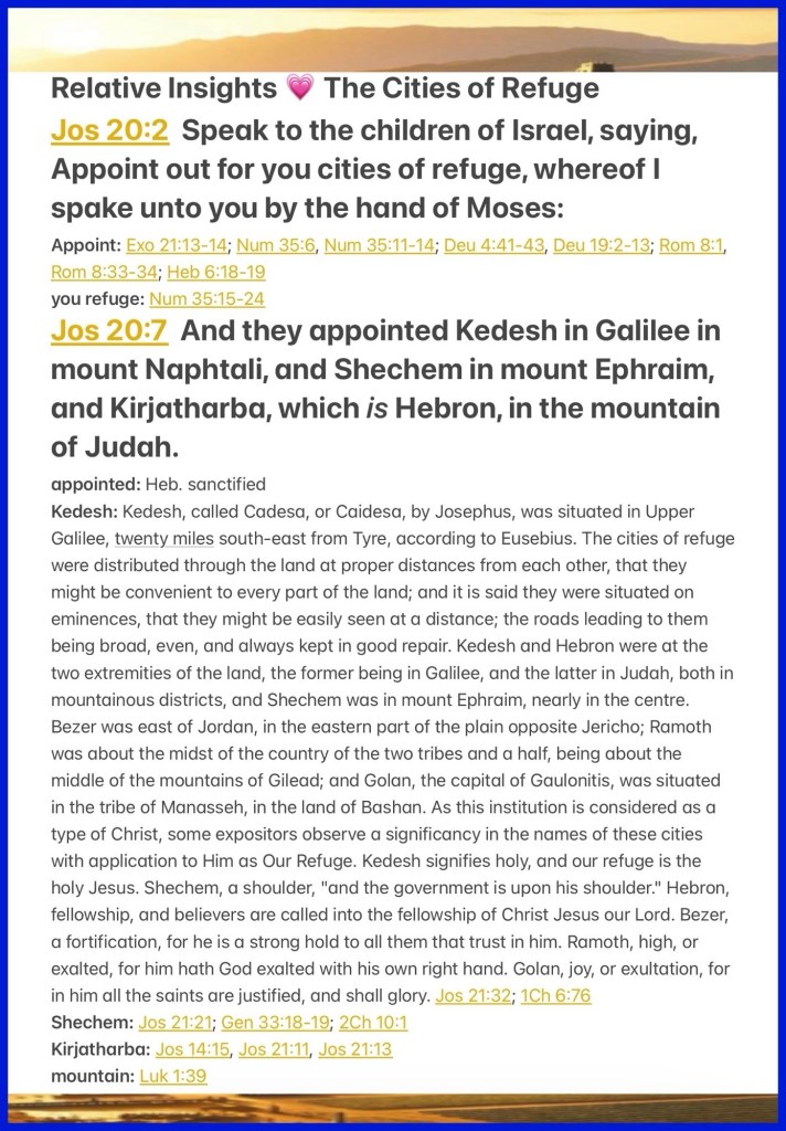 ““Speak to the children of Israel, saying: ‘Appoint for yourselves cities of refuge, of which I spoke to you through Moses, …. So they appointed Kedesh in Galilee, in the mountains of Naphtali, Shechem in the mountains of Ephraim, and Kirjath Arba (which is Hebron) in the mountains of Judah.” Joshua 20:2, 7