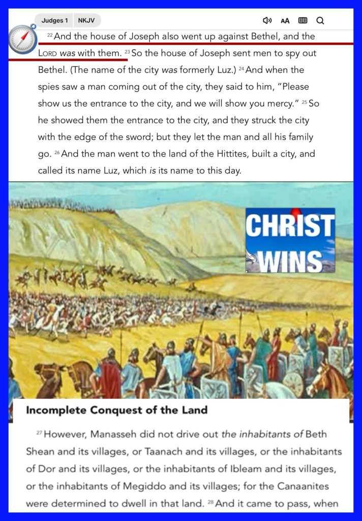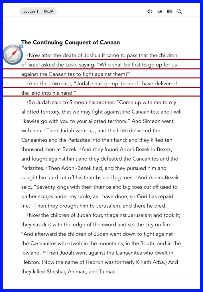 “Now after the death of Joshua it came to pass that the children of Israel asked the Lord, saying, “Who shall be first to go up for us against the Canaanites to fight against them?” And the Lord said, “Judah shall go up. Indeed I have delivered the land into his hand.” … And the house of Joseph also went up against Bethel, and the Lord was with them.” Judges 1:1-2, 22