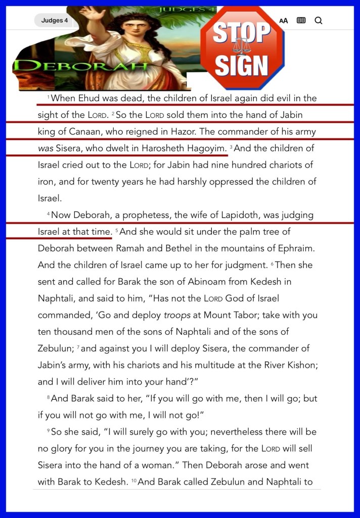 “When Ehud was dead, the children of Israel again did evil in the sight of the Lord. So the Lord sold them into the hand of Jabin king of Canaan, who reigned in Hazor. The commander of his army was Sisera, who dwelt in Harosheth Hagoyim. Now Deborah, a prophetess, the wife of Lapidoth, was judging Israel at that time.” Judges 4:1-2, 4