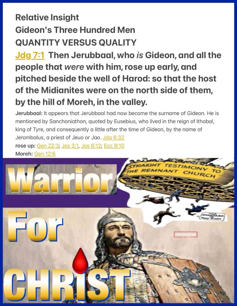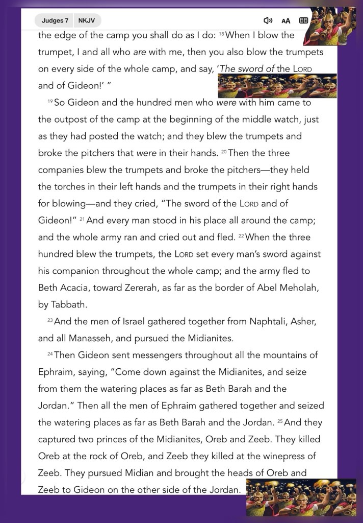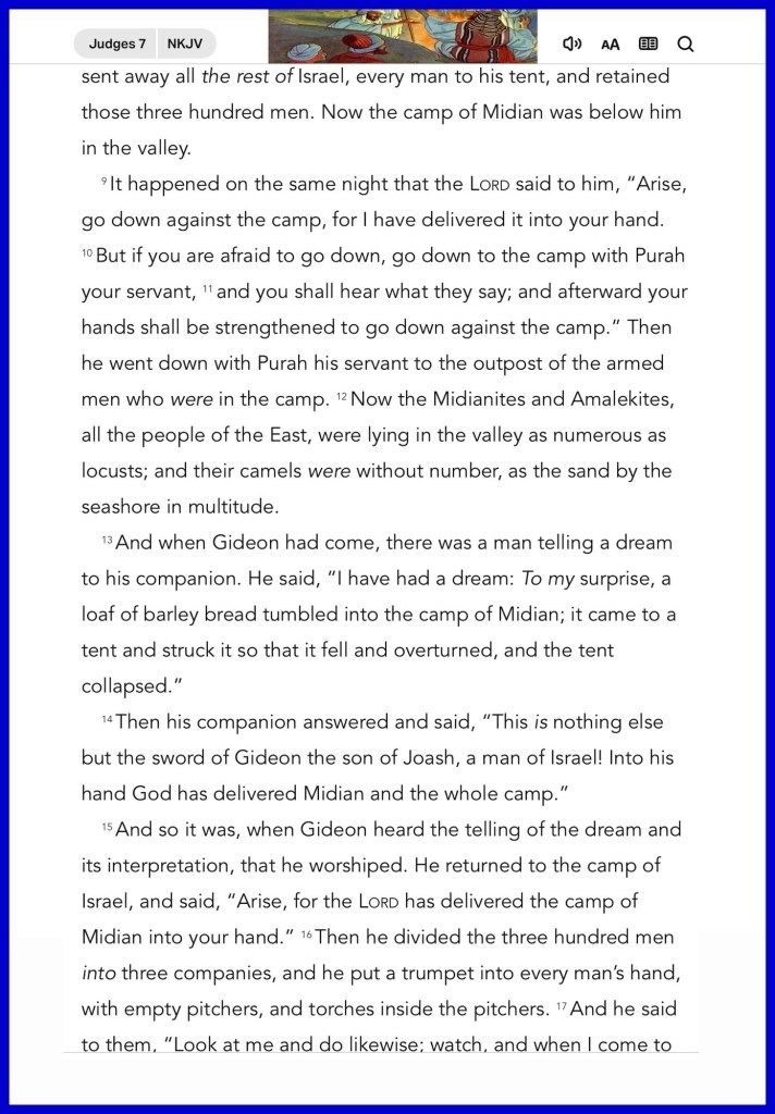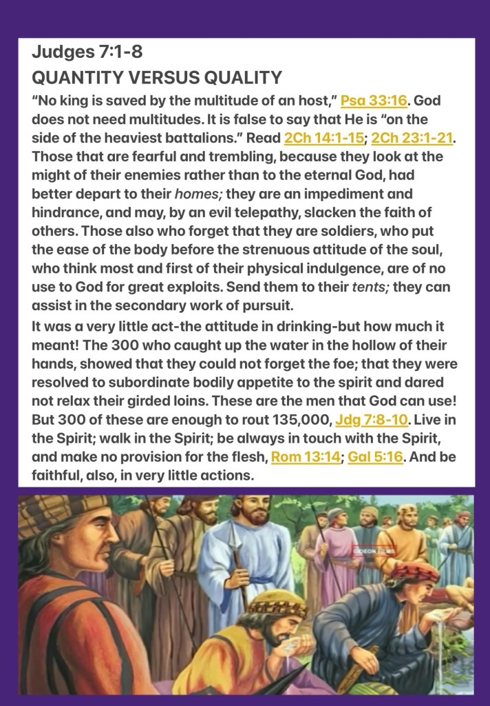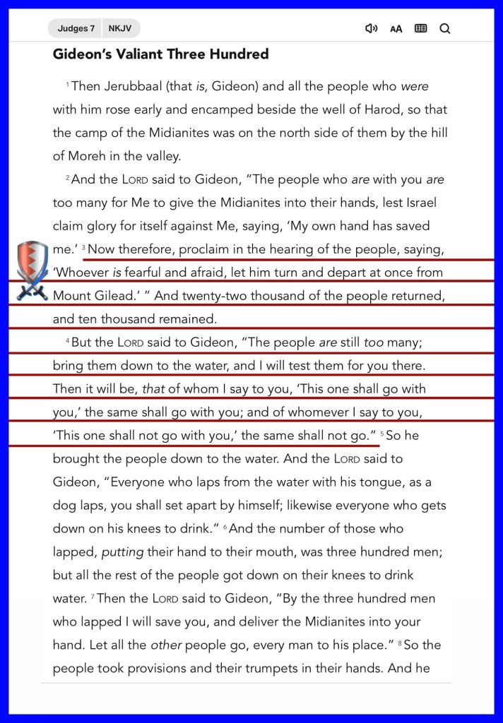 “Now therefore, proclaim in the hearing of the people, saying, ‘Whoever is fearful and afraid, let him turn and depart at once from Mount Gilead.’ ” And twenty-two thousand of the people returned, and ten thousand remained. But the Lord said to Gideon, “The people are still too many; bring them down to the water, and I will test them for you there. Then it will be, that of whom I say to you, ‘This one shall go with you,’ the same shall go with you; and of whomever I say to you, ‘This one shall not go with you,’ the same shall not go.” So he brought the people down to the water. And the Lord said to Gideon, “Everyone who laps from the water with his tongue, as a dog laps, you shall set apart by himself; likewise everyone who gets down on his knees to drink.”” Judges 7:3-5
