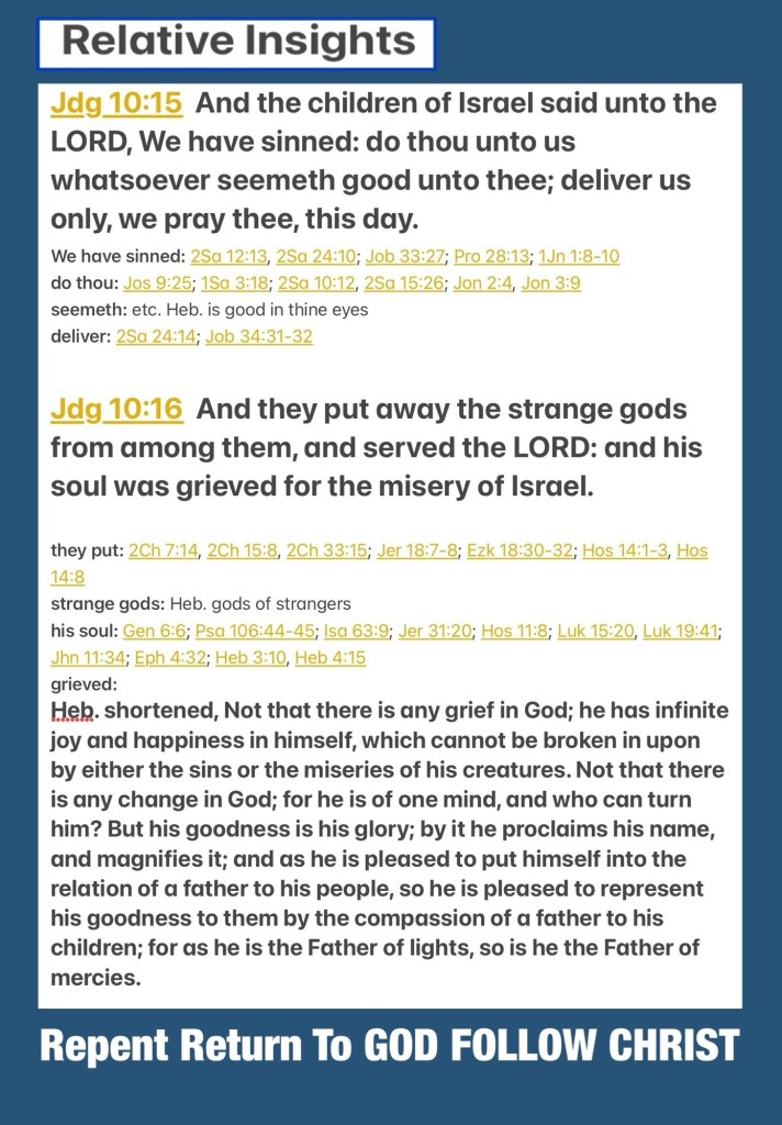 “And the children of Israel cried out to the Lord, saying, “We have sinned against You, because we have both forsaken our God and served the Baals!” … So the Lord said to the children of Israel, “Did I not deliver you from the Egyptians and from the Amorites and from the people of Ammon and from the Philistines? … And the children of Israel said to the Lord, “We have sinned! Do to us whatever seems best to You; only deliver us this day, we pray.” … So they put away the foreign gods from among them and served the Lord. And His soul could no longer endure the misery of Israel.” Judges 10:10-11, 15-16