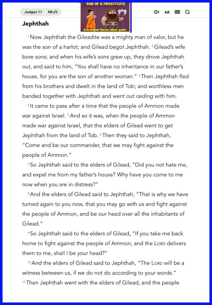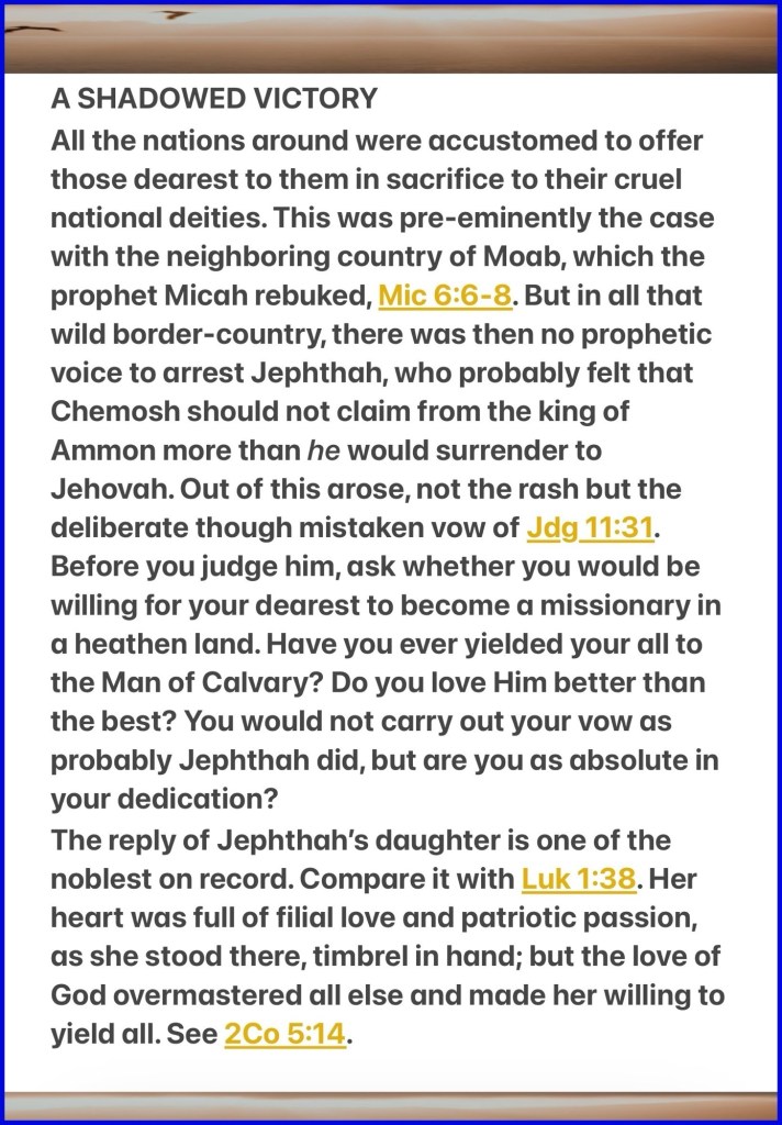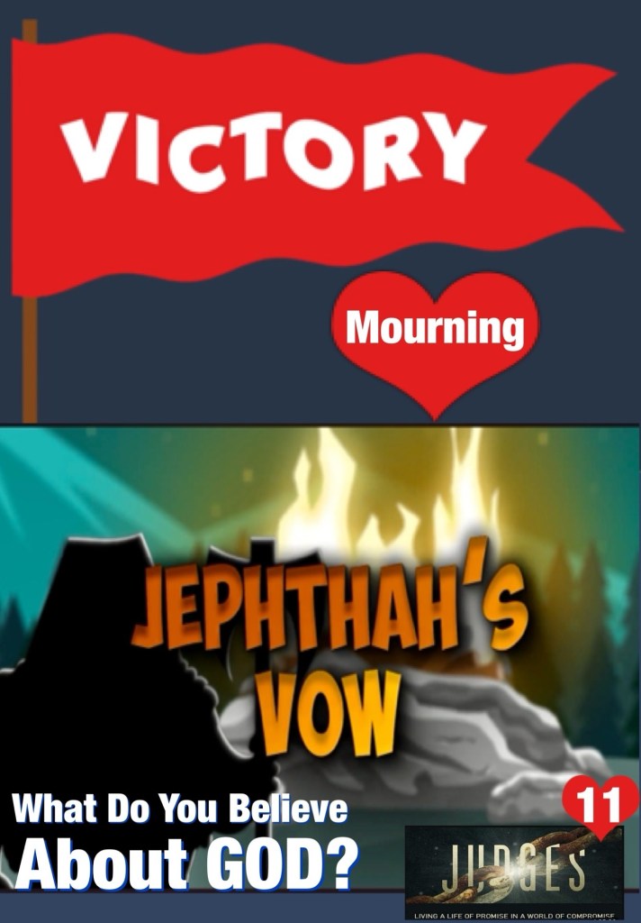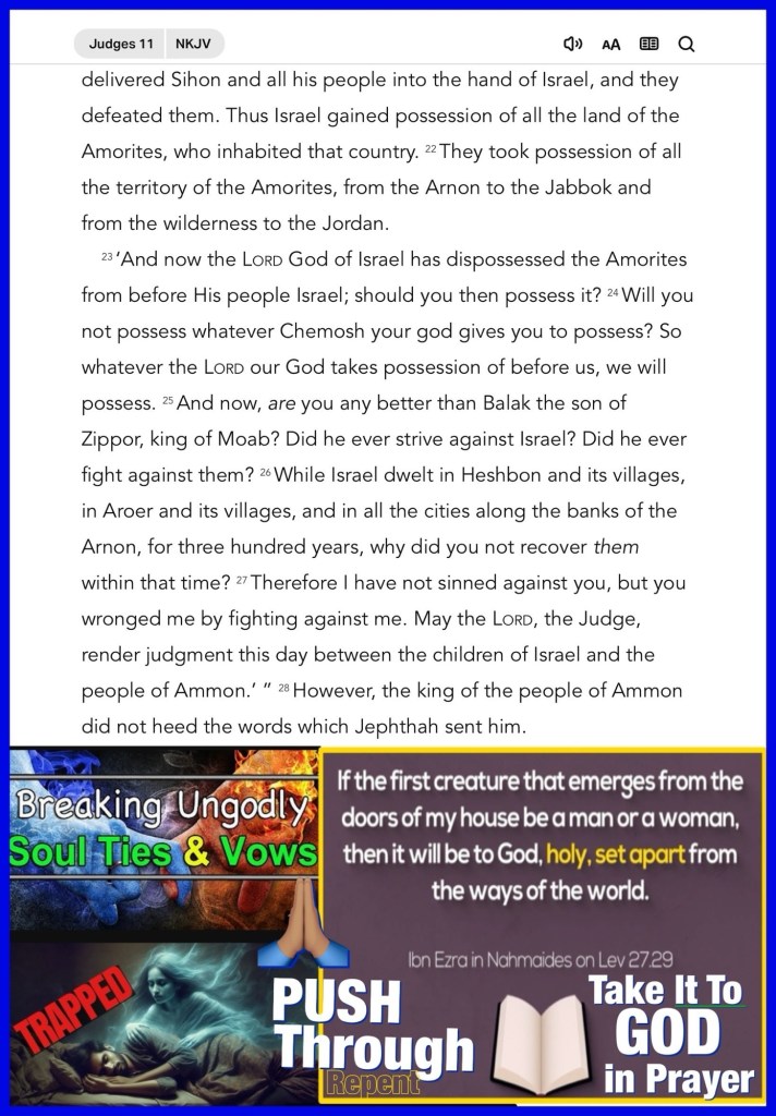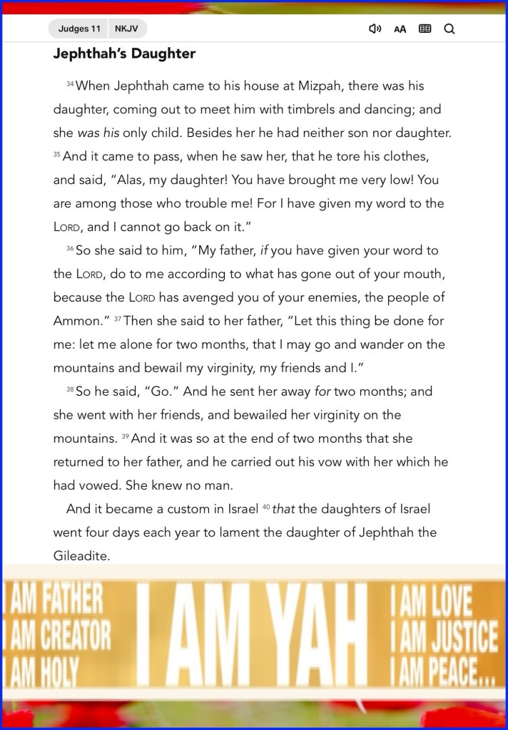 “Then the Spirit of the Lord came upon Jephthah, and he passed through Gilead and Manasseh, and passed through Mizpah of Gilead; and from Mizpah of Gilead he advanced toward the people of Ammon. And Jephthah made a vow to the Lord, and said, “If You will indeed deliver the people of Ammon into my hands, then it will be that whatever comes out of the doors of my house to meet me, when I return in peace from the people of Ammon, shall surely be the Lord’s, and I will offer it up as a burnt offering.”” Judges 11:29-31