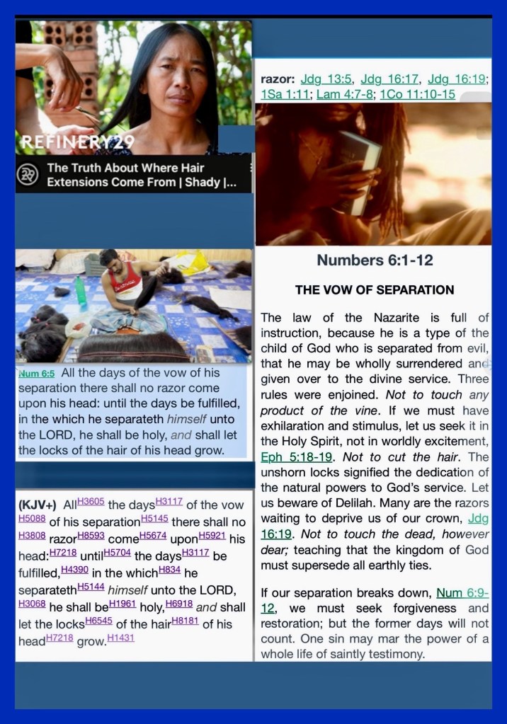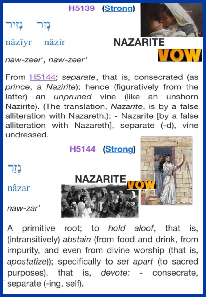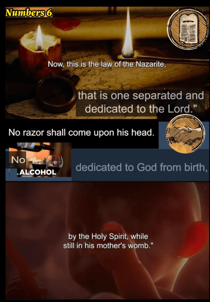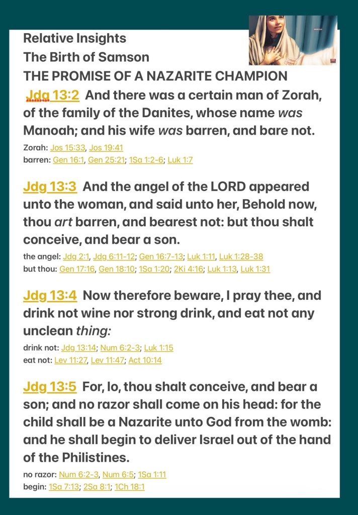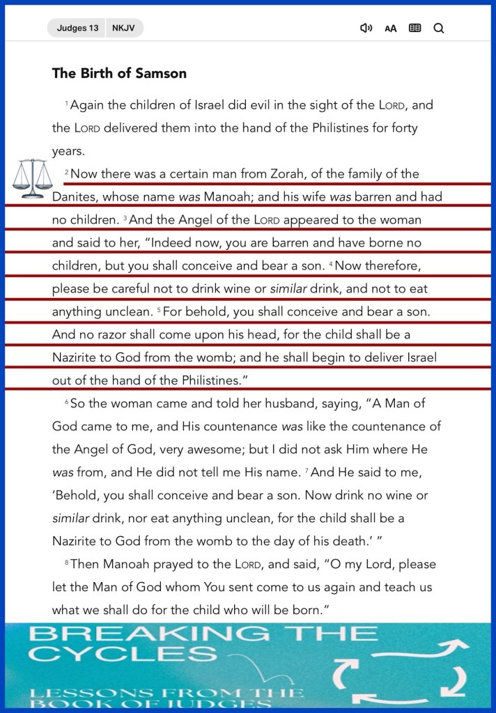 “Now there was a certain man from Zorah, of the family of the Danites, whose name was Manoah; and his wife was barren and had no children. And the Angel of the Lord appeared to the woman and said to her, “Indeed now, you are barren and have borne no children, but you shall conceive and bear a son. Now therefore, please be careful not to drink wine or similar drink, and not to eat anything unclean. For behold, you shall conceive and bear a son. And no razor shall come upon his head, for the child shall be a Nazirite to God from the womb; and he shall begin to deliver Israel out of the hand of the Philistines.”” Judges 13:2-5