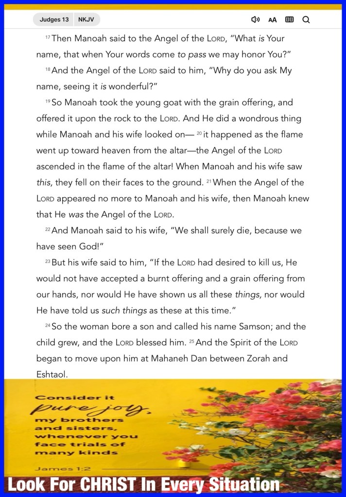Today’s lesson Judges 13 / 21, today’s verses: “To him the doorkeeper opens, and the sheep hear his voice; and he calls his own sheep by name and leads them out. And when he brings out his own sheep, he goes before them; and the sheep follow him, for they know his voice. Yet they will by no means follow a stranger, but will flee from him, for they do not know the voice of strangers.”” John 10:3-5 “My brethren, count it all joy when you fall into various trials, knowing that the testing of your faith produces patience.” James 1:2-3
