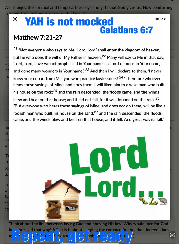 Greetings BeLoved Happy Preparation Day, I pray that your week has been uneventful in a good way; I know many of you have experienced great: profound loss/ change / upset and my thoughts and prayers go out for you, the unfortunate reality is it is a sign of the times so I’m pleading as I know our Heavenly FATHER Is also, that we get serious about Knowing The GOD we claim to serve; on a base level that begins with knowing THE WORD for ourselves. The spiritual warfare we’re enduring is only going to get worse, judgement (the weeding out process) “begins at the house of GOD” “For the time has come for judgment to begin at the house of God; and if it begins with us first, what will be the end of those who do not obey the gospel of God?” I Peter 4:17 Spiritual Warfare 101: Worship Matters: Know The Difference Between The Holy (Dedicated To GOD) and What Is Not (The unholy or profane) please hear me when I’m saying this: All Unacceptable Worship is a win in the enemies column but greater still satan claims it for himself. Prayerfully consider (reconsider, repent if you have to and pray to Be Sealed, fully enabled for victory in the days ahead) our Redemption Draws Nigh! Get Ready in JESUS CHRIST Name … Stay Ready HalleluYAH!