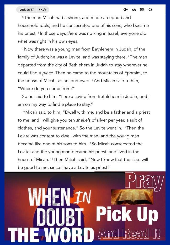 Today’s lesson Judges 17/ 21, today’s verses: “Therefore we do not lose heart. Even though our outward man is perishing, yet the inward man is being renewed day by day.” II Corinthians 4:16 “Jesus said to him, “Thomas, because you have seen Me, you have believed. Blessed are those who have not seen and yet have believed.”” John 20:29