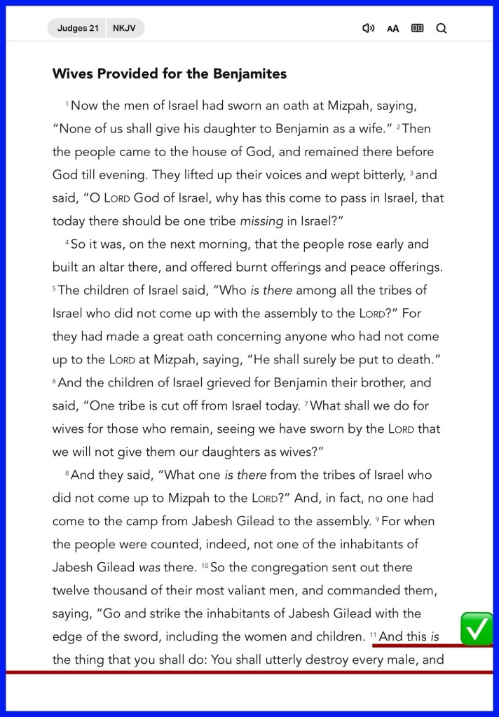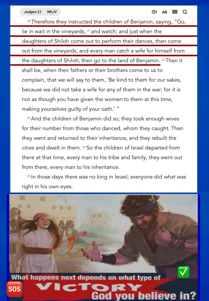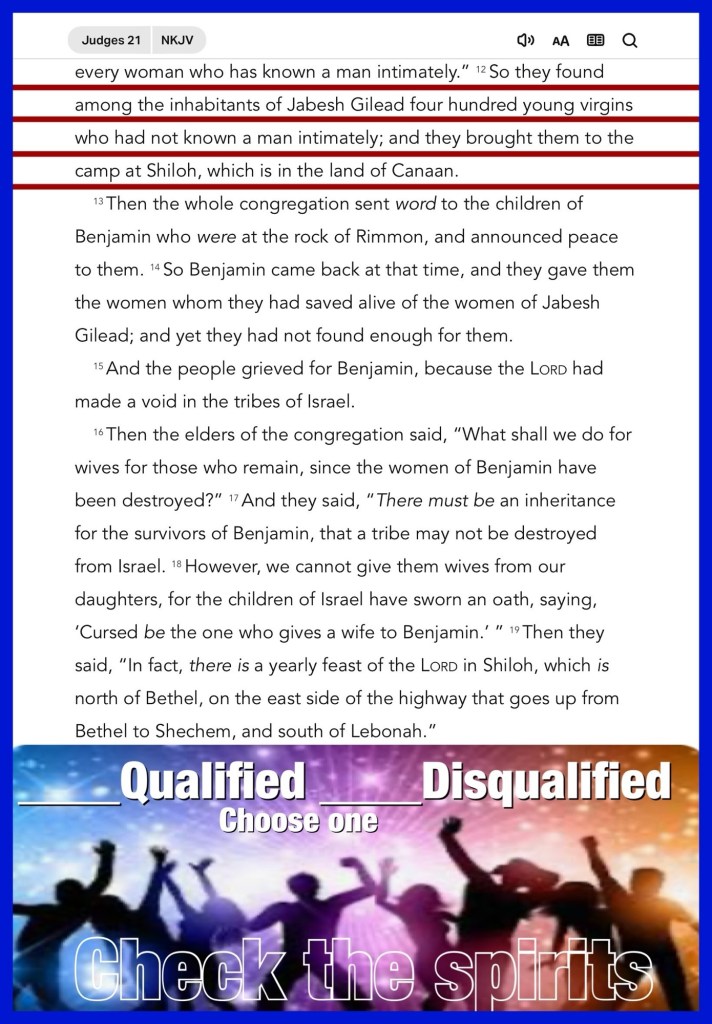 “And this is the thing that you shall do: You shall utterly destroy every male, and every woman who has known a man intimately.” So they found among the inhabitants of Jabesh Gilead four hundred young virgins who had not known a man intimately; and they brought them to the camp at Shiloh, which is in the land of Canaan. Therefore they instructed the children of Benjamin, saying, “Go, lie in wait in the vineyards, and watch; and just when the daughters of Shiloh come out to perform their dances, then come out from the vineyards, and every man catch a wife for himself from the daughters of Shiloh; then go to the land of Benjamin.” Judges 21:11-12, 20-21