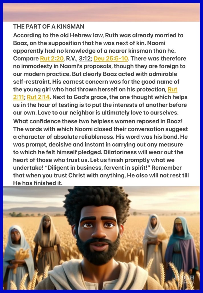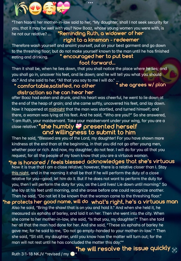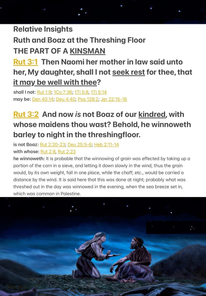 “Then Naomi her mother-in-law said to her, “My daughter, shall I not seek security for you, that it may be well with you? Now Boaz, whose young women you were with, is he not our relative? In fact, he is winnowing barley tonight at the threshing floor.” Ruth 3:1-2