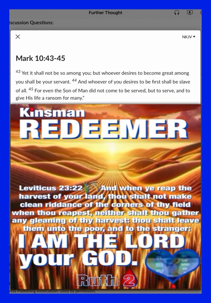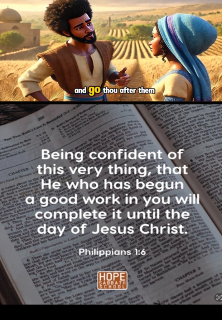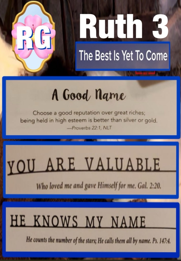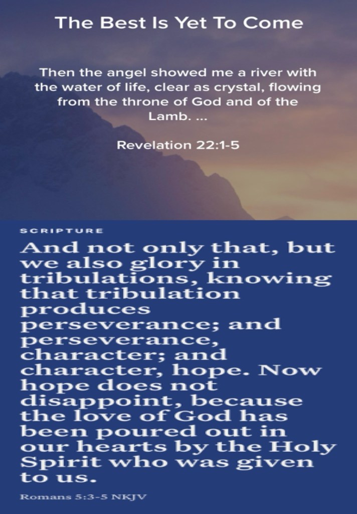 Today’s lesson Ruth 3/ 4, today’s verses: “And he showed me a pure river of water of life, clear as crystal, proceeding from the throne of God and of the Lamb. In the middle of its street, and on either side of the river, was the tree of life, which bore twelve fruits, each tree yielding its fruit every month. The leaves of the tree were for the healing of the nations. And there shall be no more curse, but the throne of God and of the Lamb shall be in it, and His servants shall serve Him. They shall see His face, and His name shall be on their foreheads. There shall be no night there: They need no lamp nor light of the sun, for the Lord God gives them light. And they shall reign forever and ever.” Revelation 22:1-5 “And not only that, but we also glory in tribulations, knowing that tribulation produces perseverance; and perseverance, character; and character, hope. Now hope does not disappoint, because the love of God has been poured out in our hearts by the Holy Spirit who was given to us.” Romans 5:3-5