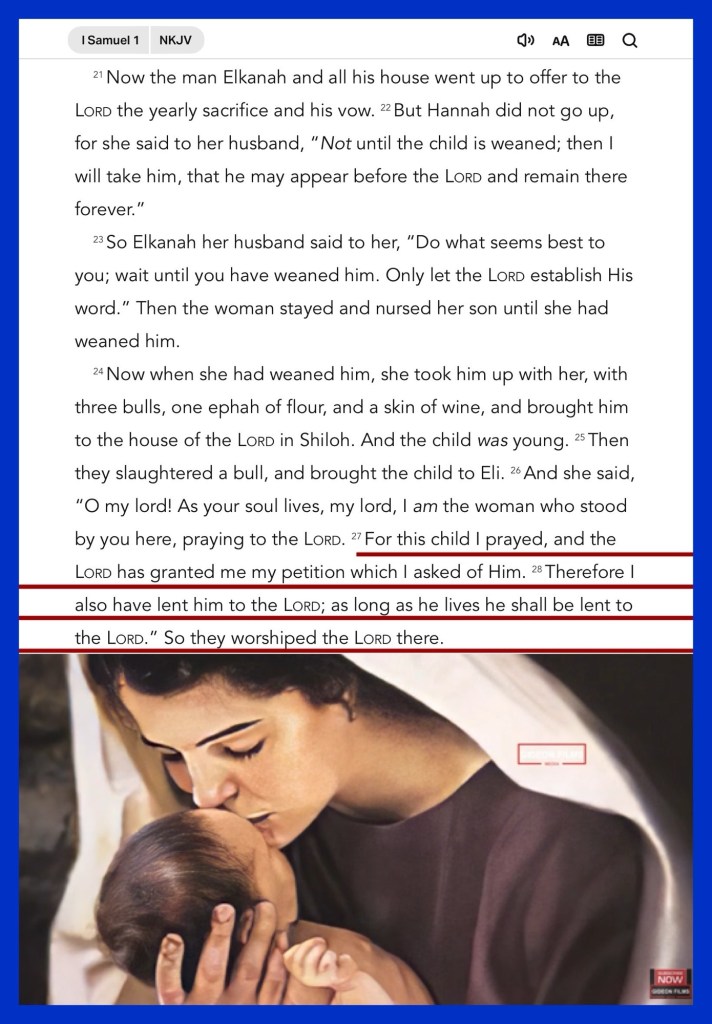 “Then they rose early in the morning and worshiped before the Lord, and returned and came to their house at Ramah. And Elkanah knew Hannah his wife, and the Lord remembered her. For this child I prayed, and the Lord has granted me my petition which I asked of Him. Therefore I also have lent him to the Lord; as long as he lives he shall be lent to the Lord.” So they worshiped the Lord there.” I Samuel 1:19, 27-28