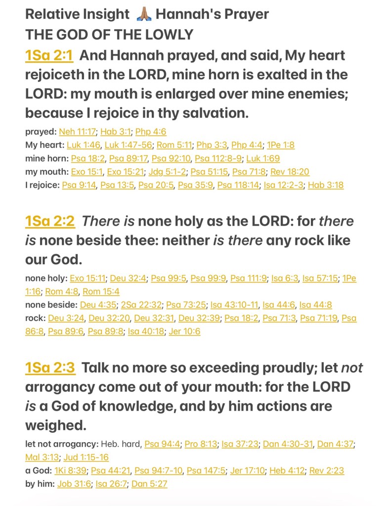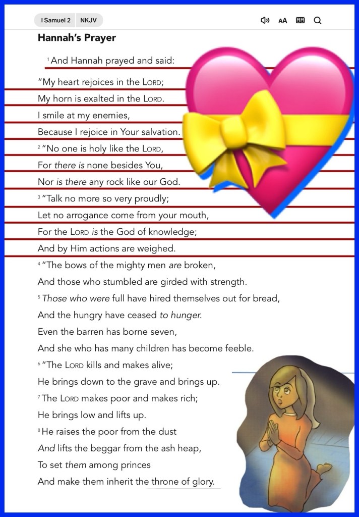 “And Hannah prayed and said: “My heart rejoices in the Lord; My horn is exalted in the Lord. I smile at my enemies, Because I rejoice in Your salvation. “No one is holy like the Lord, For there is none besides You, Nor is there any rock like our God. “Talk no more so very proudly; Let no arrogance come from your mouth, For the Lord is the God of knowledge; And by Him actions are weighed. … Now the sons of Eli were corrupt; they did not know the Lord.” I Samuel 2:1-3, 12