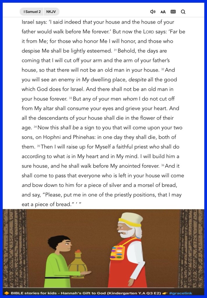 Today’s lesson 1 Samuel 2/ 31, today’s verses: “I am the door. If anyone enters by Me, he will be saved, and will go in and out and find pasture.” John 10:9 “Therefore be imitators of God as dear children.” Ephesians 5:1