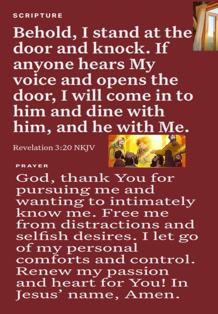 Today’s lesson 1 Samuel 4/31, today’s verses: “For I know the thoughts that I think toward you, says the Lord, thoughts of peace and not of evil, to give you a future and a hope.” Jeremiah 29:11 “Behold, I stand at the door and knock. If anyone hears My voice and opens the door, I will come in to him and dine with him, and he with Me.” Revelation 3:20