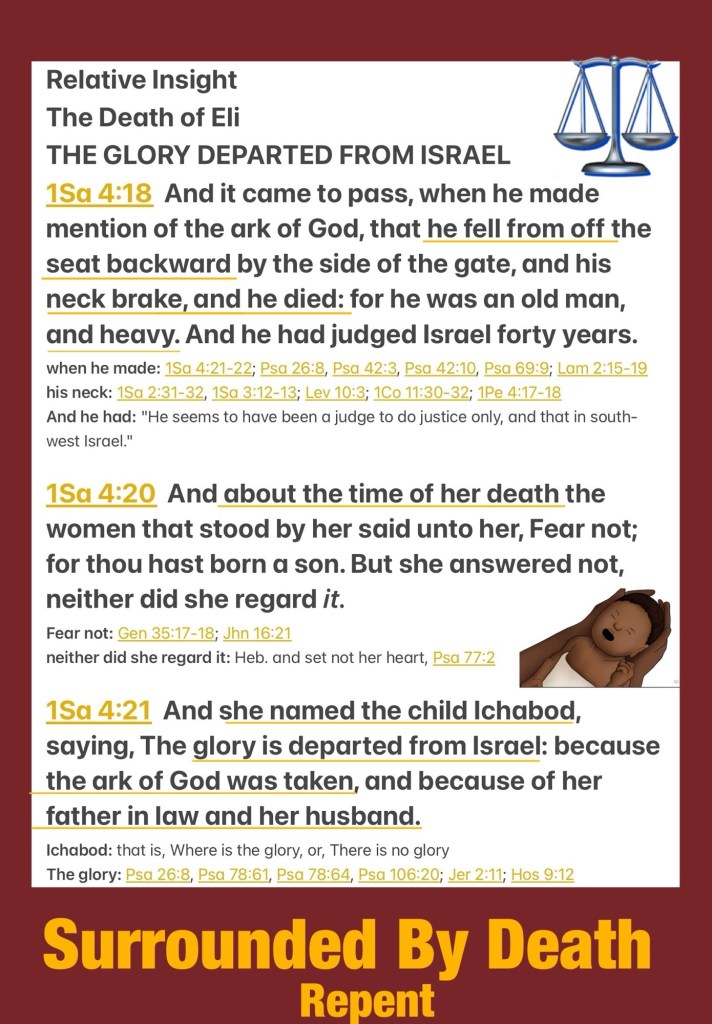 “Then it happened, when he made mention of the ark of God, that Eli fell off the seat backward by the side of the gate; and his neck was broken and he died, for the man was old and heavy. And he had judged Israel forty years. And about the time of her death the women who stood by her said to her, “Do not fear, for you have borne a son.” But she did not answer, nor did she regard it. Then she named the child Ichabod, saying, “The glory has departed from Israel!” because the ark of God had been captured and because of her father-in-law and her husband.” I Samuel 4:18, 20-21