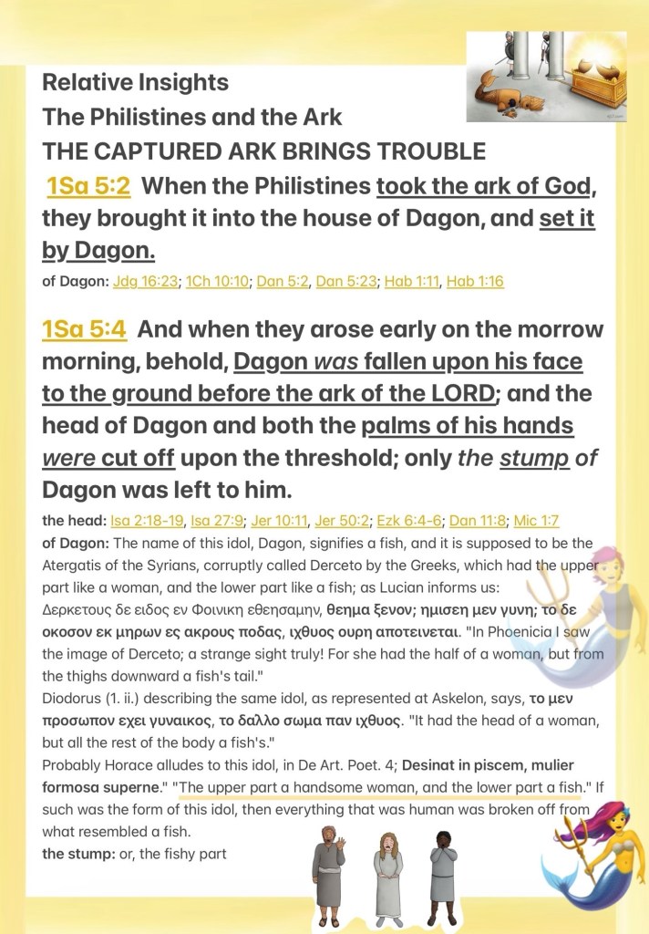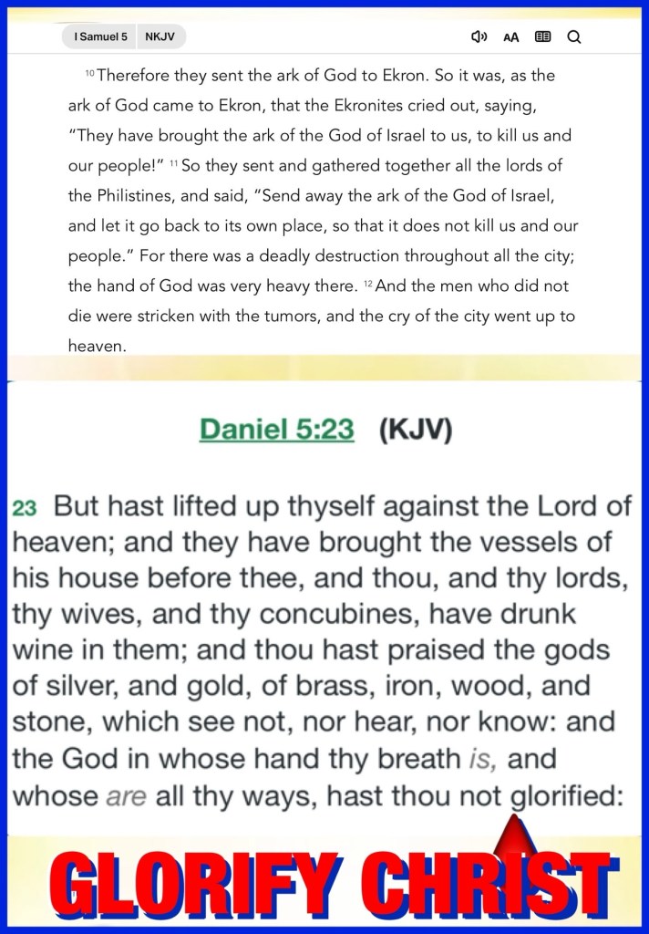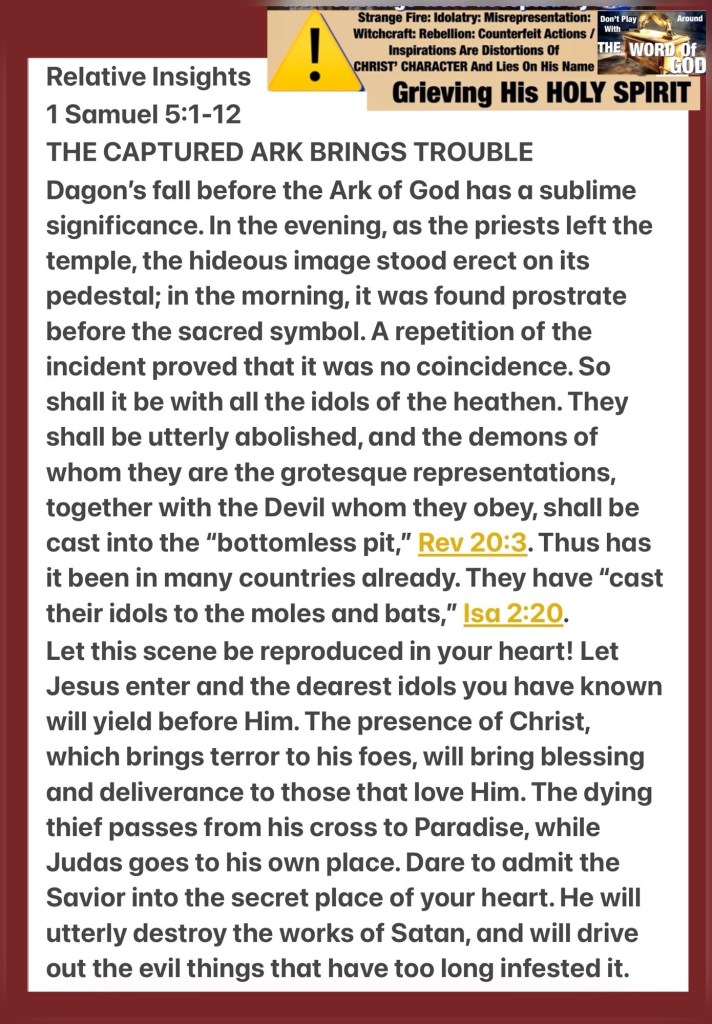 Greetings BeLoved child of THE MOST HIGH GOD YAH (JESUS CHRIST) today’s lesson is an urgent PSA … So You Want To Put An Idol Before GOD? Spiritual Warfare Fact: THE WORD Of GOD Exposes Sin, Put Away The Evil From Among You, YAH Is Not In A Contest With Anyone or Anything ⚠️ GOD Will Teardown Your Idol’s. Repent. The Capture Of The Ark Provokes GOD And He Will Show Up To Defend His Name: Honor: Position; as in today’s passage we are ill equipped (no coincidence) to do battle with GOD (THE GREATEST SPIRITUAL ENTITY HIGHEST RANKING ALL AUTHORITY: CREATOR) It’s past time we get serious about Knowing THE WORD, Obeying His Laws, and Allowing Him To Be LORD And SAVIOR of our lives (souls), we are created in His Image so why should we Relinquish our authority (responsibility: dominion) to amalgamated demonic creatures images fashioned by corrupt man.🧐