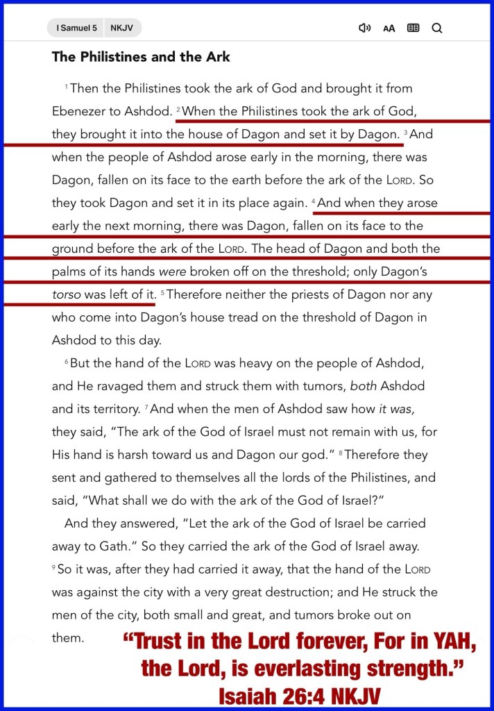 “When the Philistines took the ark of God, they brought it into the house of Dagon and set it by Dagon. And when they arose early the next morning, there was Dagon, fallen on its face to the ground before the ark of the Lord. The head of Dagon and both the palms of its hands were broken off on the threshold; only Dagon’s torso was left of it.” I Samuel 5:2, 4