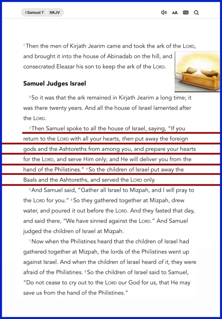 “Then Samuel spoke to all the house of Israel, saying, “If you return to the Lord with all your hearts, then put away the foreign gods and the Ashtoreths from among you, and prepare your hearts for the Lord, and serve Him only; and He will deliver you from the hand of the Philistines.” So the children of Israel put away the Baals and the Ashtoreths, and served the Lord only.” I Samuel 7:3-4