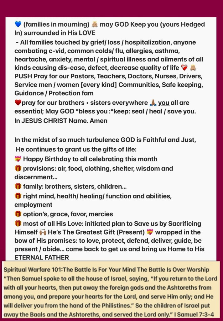 FATHER YAH Forgive us, we Know Not what we’re Doing, Please Deliver us from evil in every form; reveal to us every (secret) sin that has formed the yoke and stronghold of the enemy in our lives, help us renounce what must be renounced, remove ourselves from the things of torment, repent and Return to You Your Property our hearts and minds in Rightful Worship: Restore: Revive and Redeem us to Yourself, Reveal Yourself to us, Teach us HOLY SPIRIT Make THE WORD Plain Heal us that we may Return to Worship You Alone, Stop the flip flop of Apostasy and the stench of waffles laced in death is my prayer Grant us Wisdom Discernment and True Love for Your WORD LAW LOVE, so we won’t be taken in by the enemy and Be Ready for You When You Come In JESUS CHRIST Name (YAHUSHA HA’MASSIACH) I pray. Amen 🛡️ Spiritual Warfare 101:The Battle Is For Your Mind The Battle Is Over Worship: Today Is The Sabbath Ordained By GOD. Spiritual Warfare Fact: If Any Man Worships The Beast And His Image REPENT NOW while we still can This Is Serious 🧐