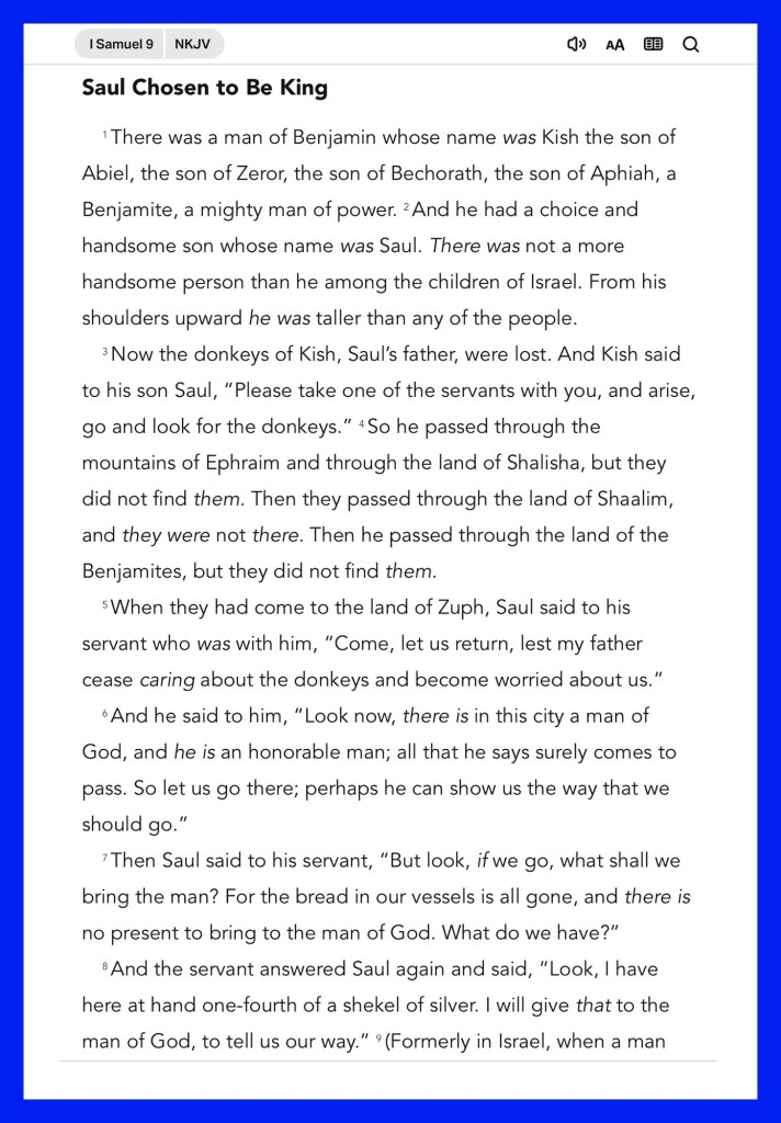 Today’s lesson 1 Samuel 9/31, today’s verses: “He who did not spare His own Son, but delivered Him up for us all, how shall He not with Him also freely give us all things.” Romans 8:32 “In the multitude of my anxieties within me, Your comforts delight my soul.” Psalms 94:19