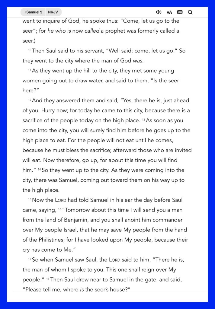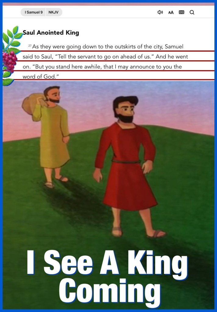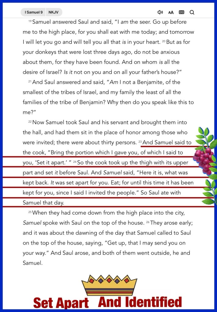“And Samuel said to the cook, “Bring the portion which I gave you, of which I said to you, ‘Set it apart.’ ” So the cook took up the thigh with its upper part and set it before Saul. And Samuel said, “Here it is, what was kept back. It was set apart for you. Eat; for until this time it has been kept for you, since I said I invited the people.” So Saul ate with Samuel that day. As they were going down to the outskirts of the city, Samuel said to Saul, “Tell the servant to go on ahead of us.” And he went on. “But you stand here awhile, that I may announce to you the word of God.”” I Samuel 9:23-24, 27