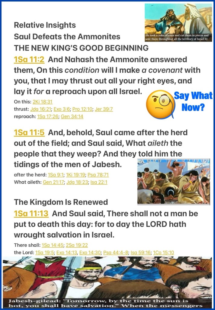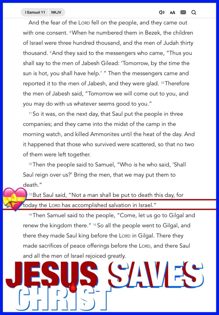 “And Nahash the Ammonite answered them, “On this condition I will make a covenant with you, that I may put out all your right eyes, and bring reproach on all Israel.” …Now there was Saul, coming behind the herd from the field; and Saul said, “What troubles the people, that they weep?” And they told him the words of the men of Jabesh. …But Saul said, “Not a man shall be put to death this day, for today the Lord has accomplished salvation in Israel.”” I Samuel 11:2, 5, 13