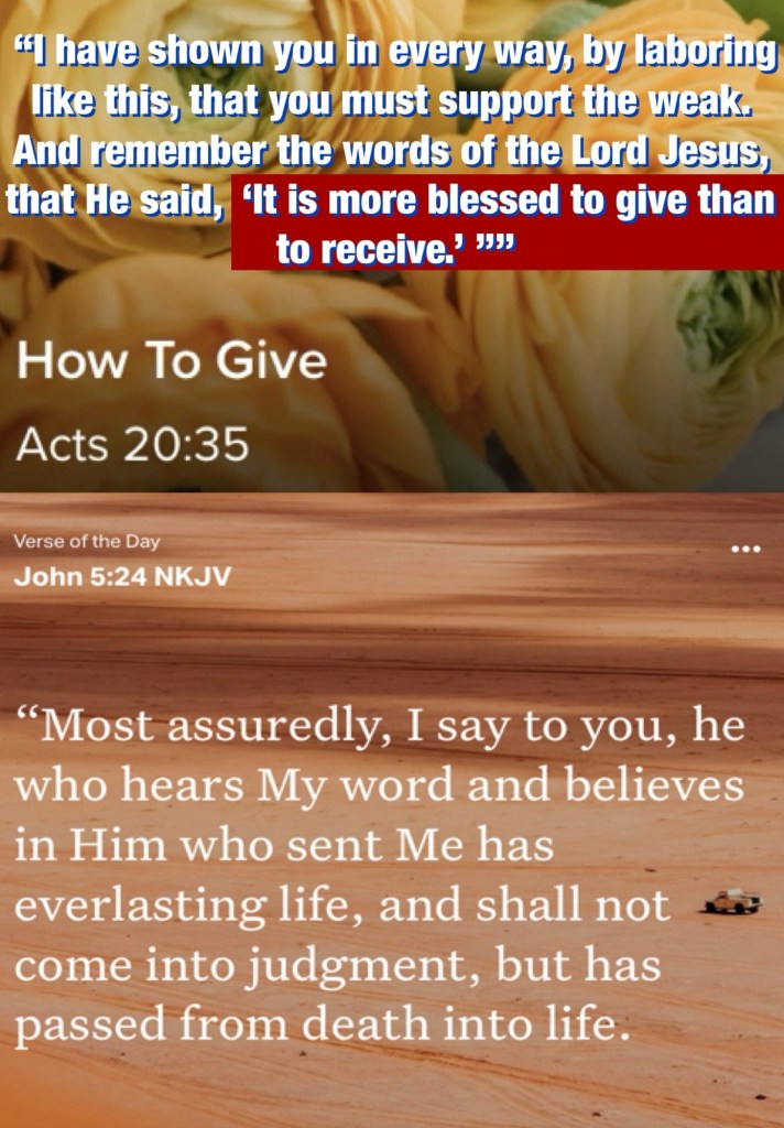 Today’s lesson 1 Samuel 12 /31, today’s verses: “I have shown you in every way, by laboring like this, that you must support the weak. And remember the words of the Lord Jesus, that He said, ‘It is more blessed to give than to receive.’ ””Acts 20:35““Most assuredly, I say to you, he who hears My word and believes in Him who sent Me has everlasting life, and shall not come into judgment, but has passed from death into life.” John 5:24