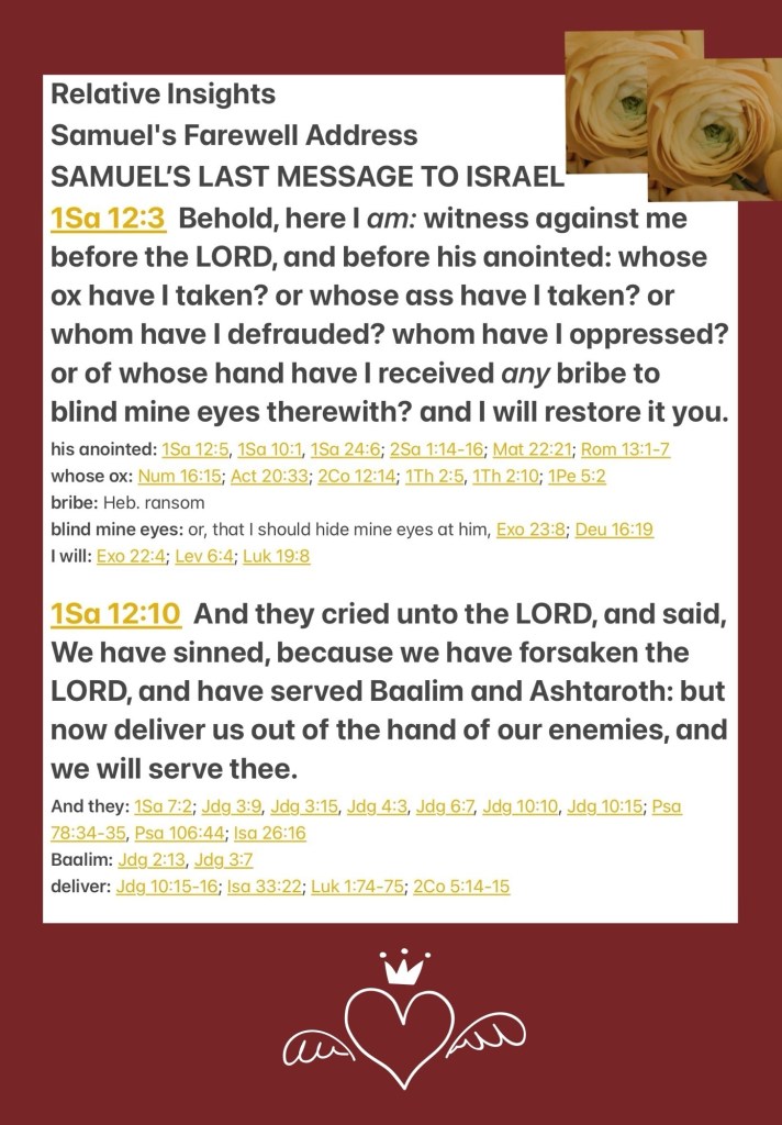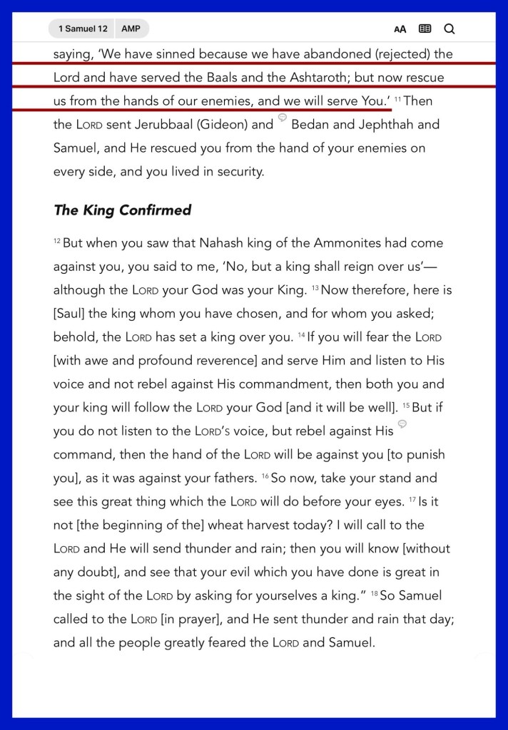 “Here I am. Witness against me before the Lord and before His anointed: Whose ox have I taken, or whose donkey have I taken, or whom have I cheated? Whom have I oppressed, or from whose hand have I received any bribe with which to blind my eyes? I will restore it to you.” Then they cried out to the Lord, and said, ‘We have sinned, because we have forsaken the Lord and served the Baals and Ashtoreths; but now deliver us from the hand of our enemies, and we will serve You.’”I Samuel 12:3, 10