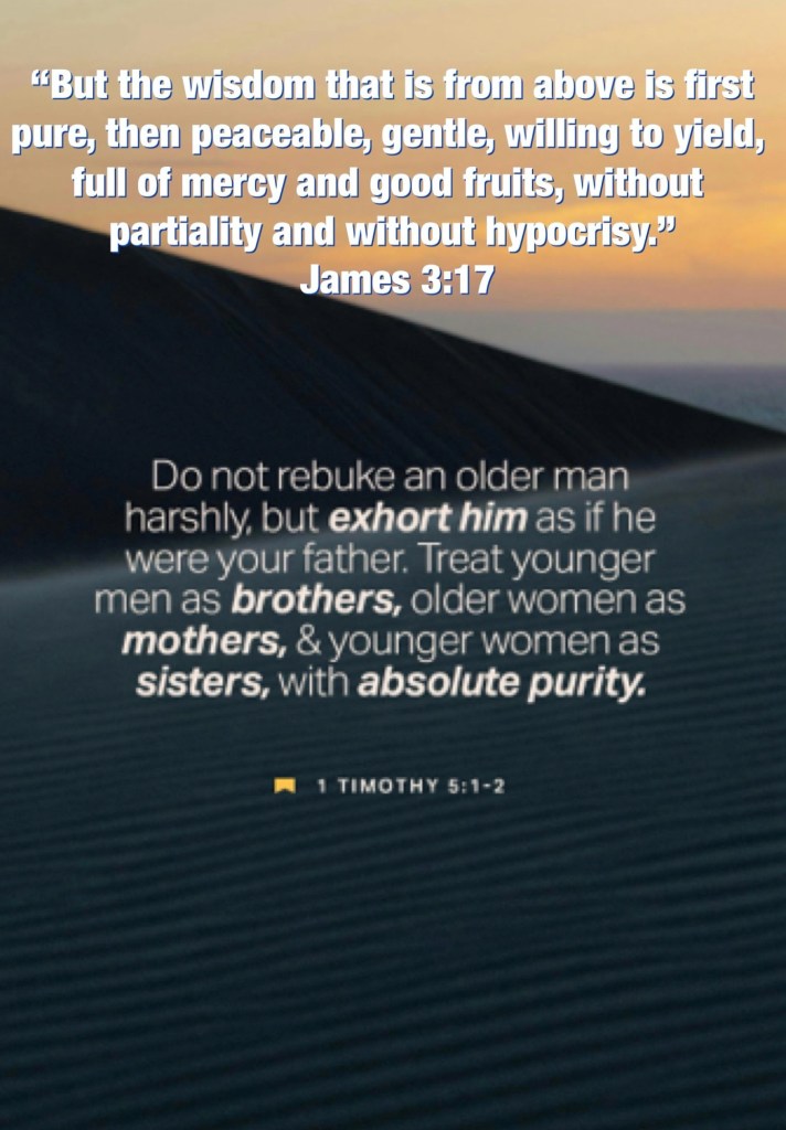 Today’s lesson 1 Samuel 13/31, today’s verses: “But the wisdom that is from above is first pure, then peaceable, gentle, willing to yield, full of mercy and good fruits, without partiality and without hypocrisy.” James 3:17 “Do not rebuke an older man, but exhort him as a father, younger men as brothers, older women as mothers, younger women as sisters, with all purity.” I Timothy 5:1-2