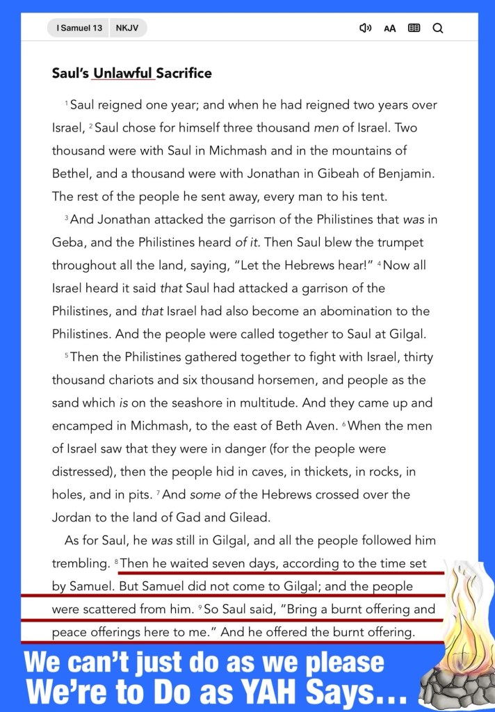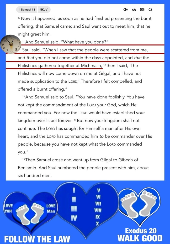 “Then he waited seven days, according to the time set by Samuel. But Samuel did not come to Gilgal; and the people were scattered from him. So Saul said, “Bring a burnt offering and peace offerings here to me.” And he offered the burnt offering. And Samuel said, “What have you done?” Saul said, “When I saw that the people were scattered from me, and that you did not come within the days appointed, and that the Philistines gathered together at Michmash,” I Samuel 13:8-9, 11