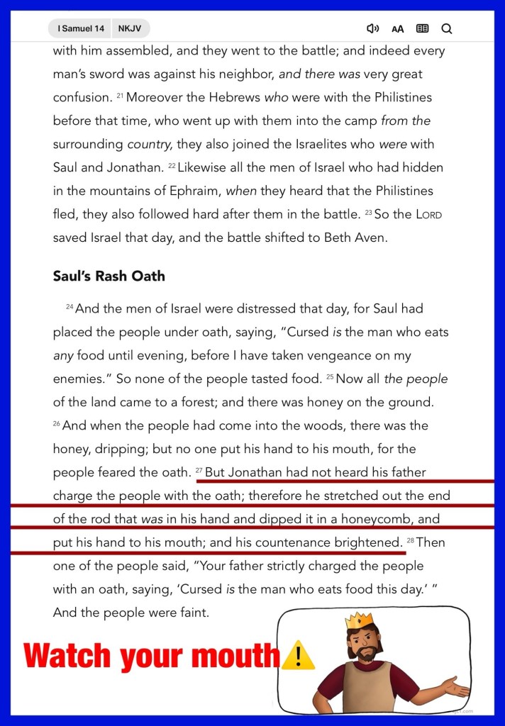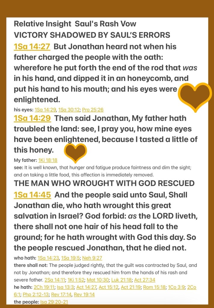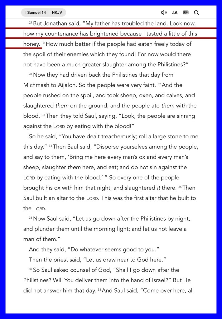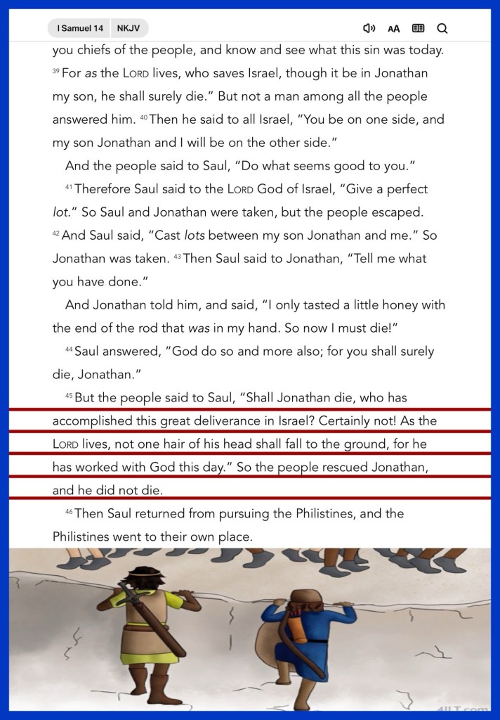“But Jonathan had not heard his father charge the people with the oath; therefore he stretched out the end of the rod that was in his hand and dipped it in a honeycomb, and put his hand to his mouth; and his countenance brightened. But Jonathan said, “My father has troubled the land. Look now, how my countenance has brightened because I tasted a little of this honey. But the people said to Saul, “Shall Jonathan die, who has accomplished this great deliverance in Israel? Certainly not! As the Lord lives, not one hair of his head shall fall to the ground, for he has worked with God this day.” So the people rescued Jonathan, and he did not die.” I Samuel 14:27, 29, 45