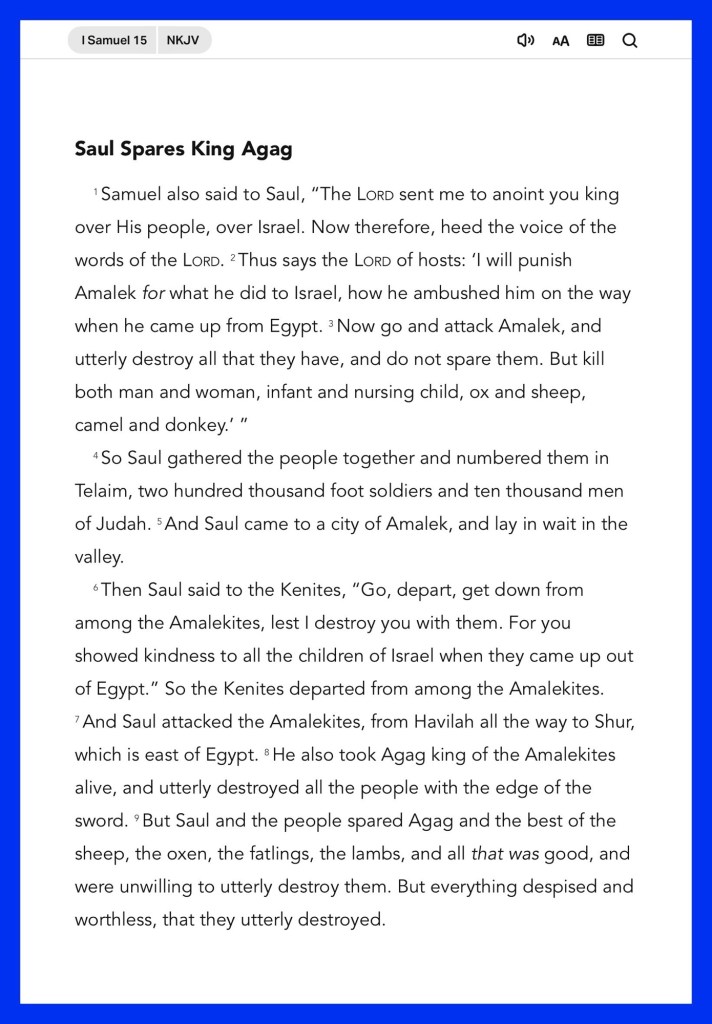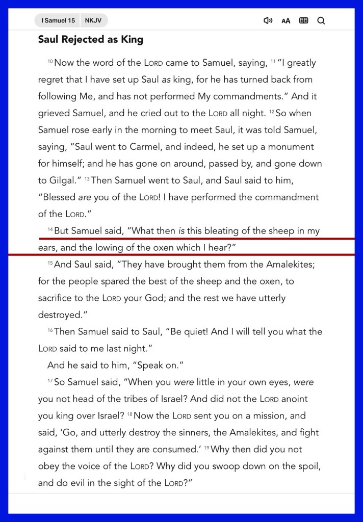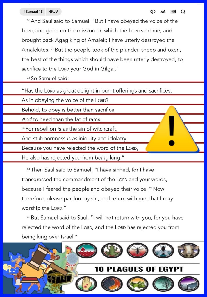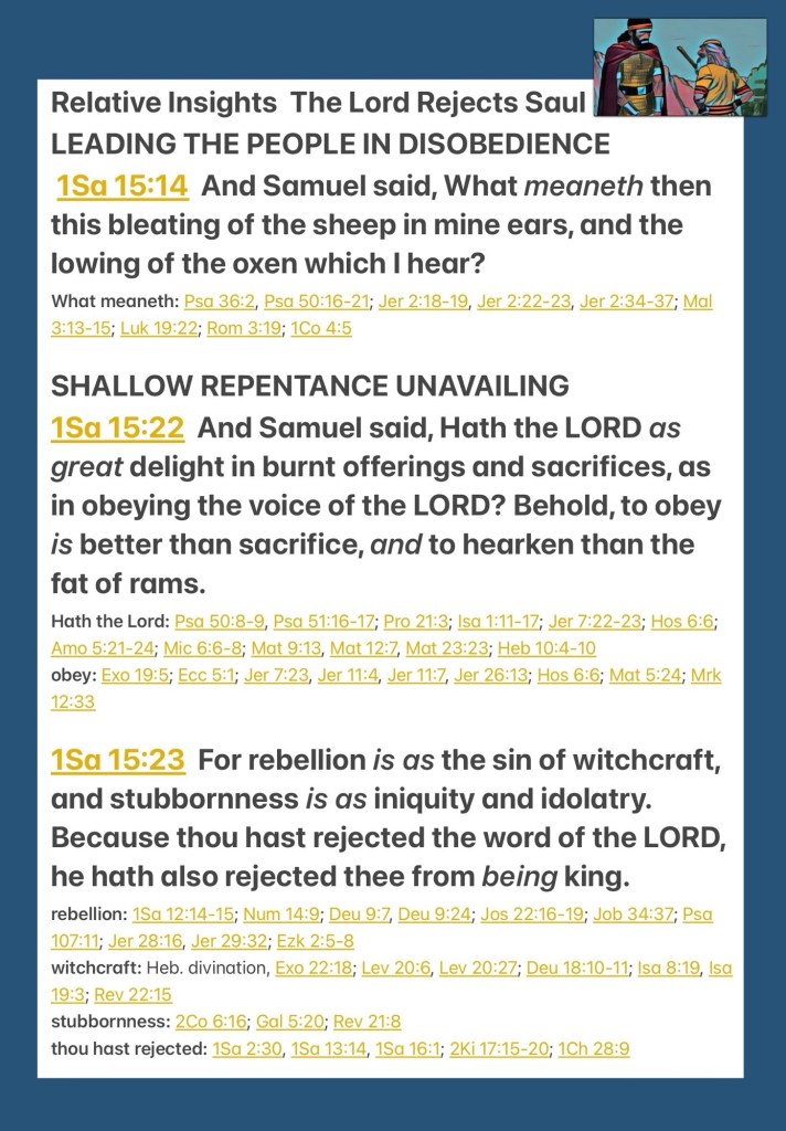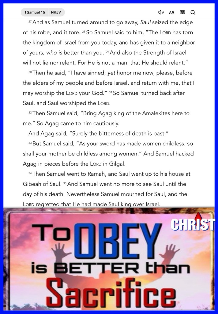 “But Samuel said, “What then is this bleating of the sheep in my ears, and the lowing of the oxen which I hear?” So Samuel said: “Has the Lord as great delight in burnt offerings and sacrifices, As in obeying the voice of the Lord? Behold, to obey is better than sacrifice, And to heed than the fat of rams. For rebellion is as the sin of witchcraft, And stubbornness is as iniquity and idolatry. Because you have rejected the word of the Lord, He also has rejected you from being king.”” I Samuel 15:14, 22-23