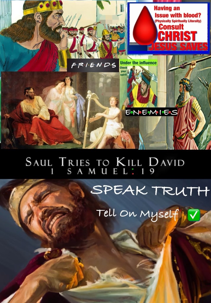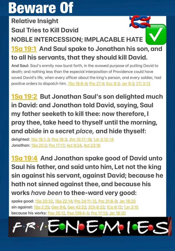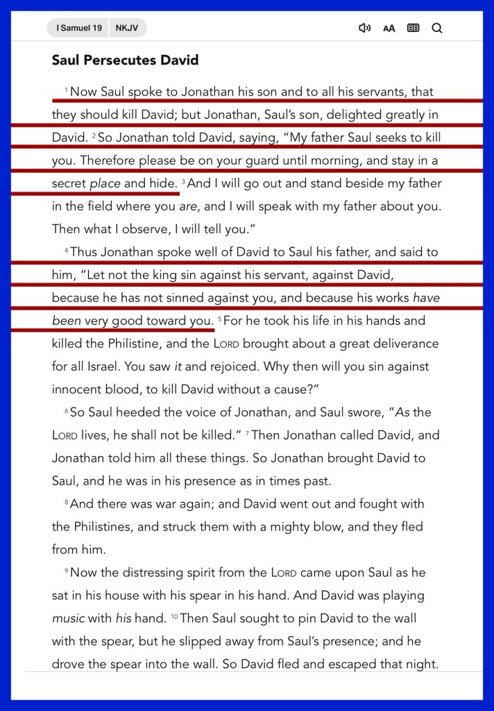 “Now Saul spoke to Jonathan his son and to all his servants, that they should kill David; but Jonathan, Saul’s son, delighted greatly in David. So Jonathan told David, saying, “My father Saul seeks to kill you. Therefore please be on your guard until morning, and stay in a secret place and hide. Thus Jonathan spoke well of David to Saul his father, and said to him, “Let not the king sin against his servant, against David, because he has not sinned against you, and because his works have been very good toward you.” I Samuel 19:1-2, 4