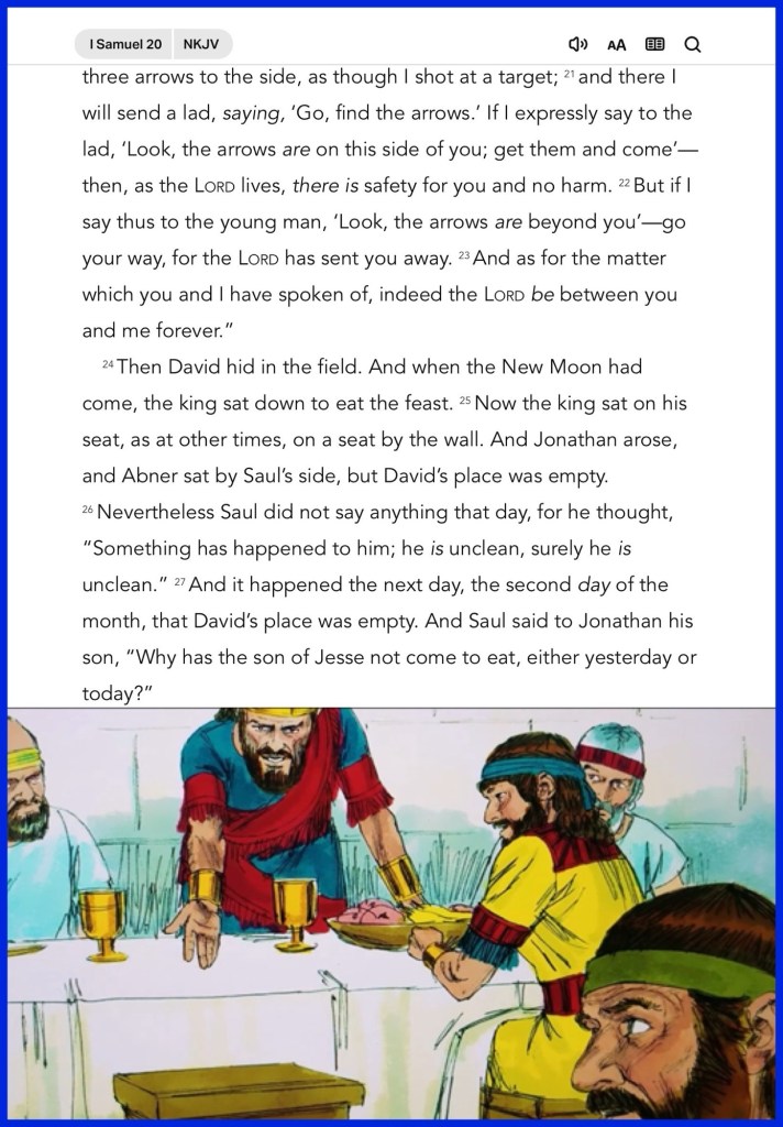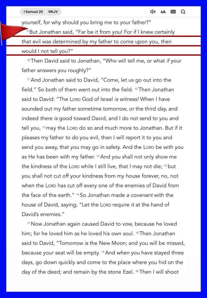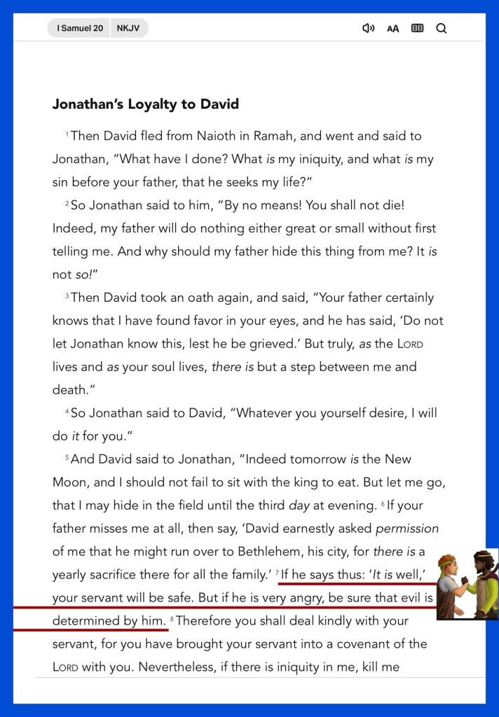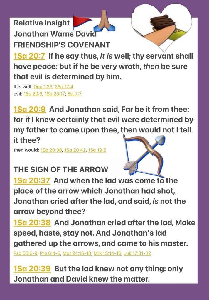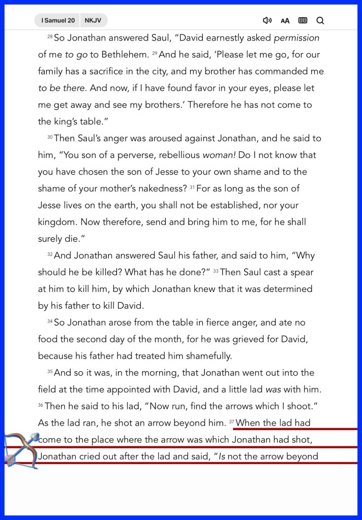 “If he says thus: ‘It is well,’ your servant will be safe. But if he is very angry, be sure that evil is determined by him. But Jonathan said, “Far be it from you! For if I knew certainly that evil was determined by my father to come upon you, then would I not tell you?” When the lad had come to the place where the arrow was which Jonathan had shot, Jonathan cried out after the lad and said, “Is not the arrow beyond you?” And Jonathan cried out after the lad, “Make haste, hurry, do not delay!” So Jonathan’s lad gathered up the arrows and came back to his master. But the lad did not know anything. Only Jonathan and David knew of the matter.” I Samuel 20:7, 9, 37-39