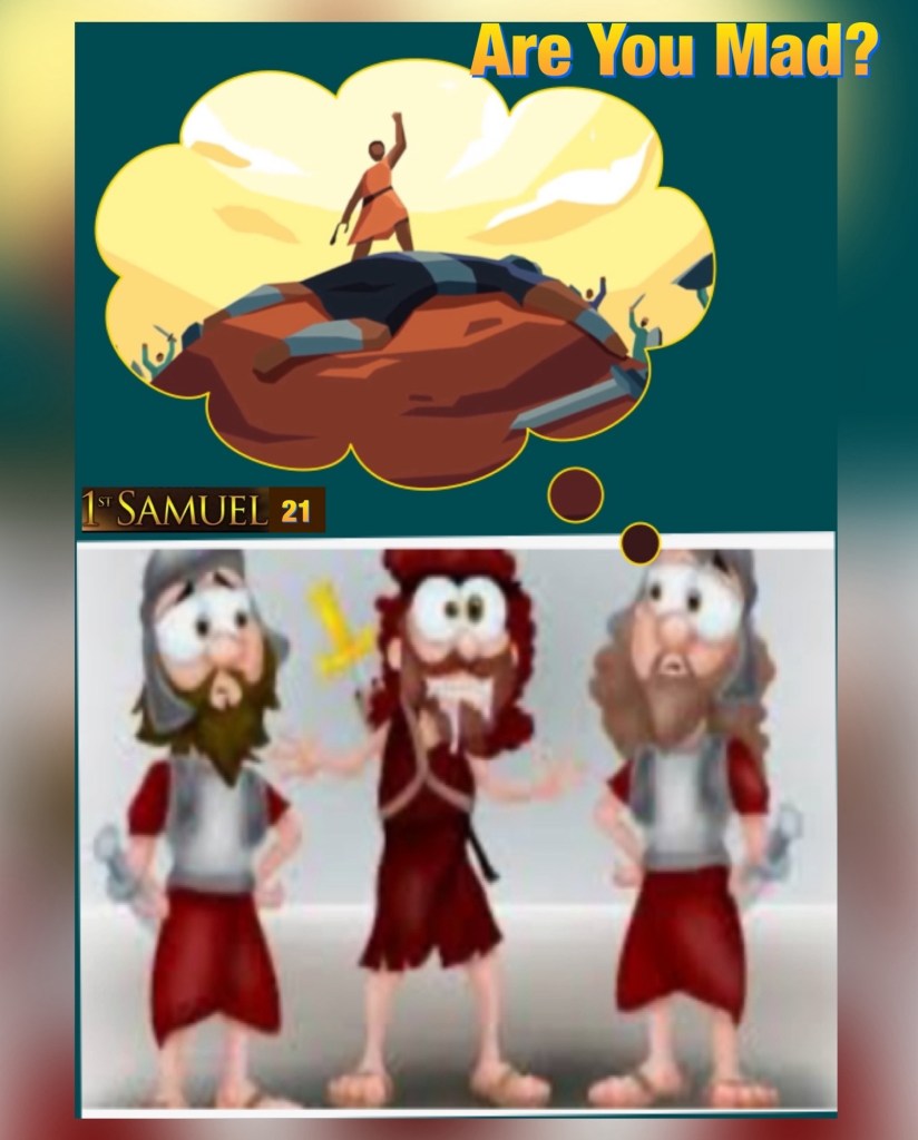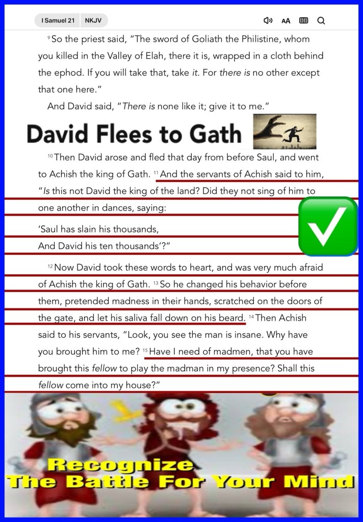 “And the servants of Achish said to him, “Is this not David the king of the land? Did they not sing of him to one another in dances, saying: ‘Saul has slain his thousands, And David his ten thousands’?” Now David took these words to heart, and was very much afraid of Achish the king of Gath. So he changed his behavior before them, pretended madness in their hands, scratched on the doors of the gate, and let his saliva fall down on his beard. Have I need of madmen, that you have brought this fellow to play the madman in my presence? Shall this fellow come into my house?”” I Samuel 21:11-13, 15
