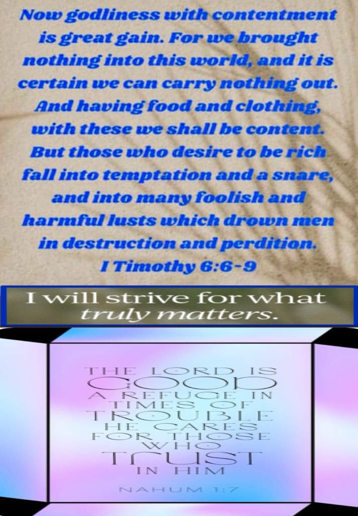 Today’s lesson 1 Samuel 22/31, today’s verses: “But those who desire to be rich fall into temptation and a snare, and into many foolish and harmful lusts which drown men in destruction and perdition.” I Timothy 6:9 “The Lord is good, A stronghold in the day of trouble; And He knows those who trust in Him.” Nahum 1:7