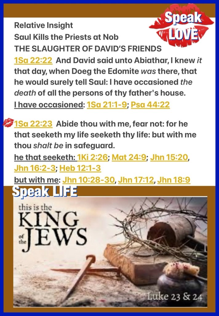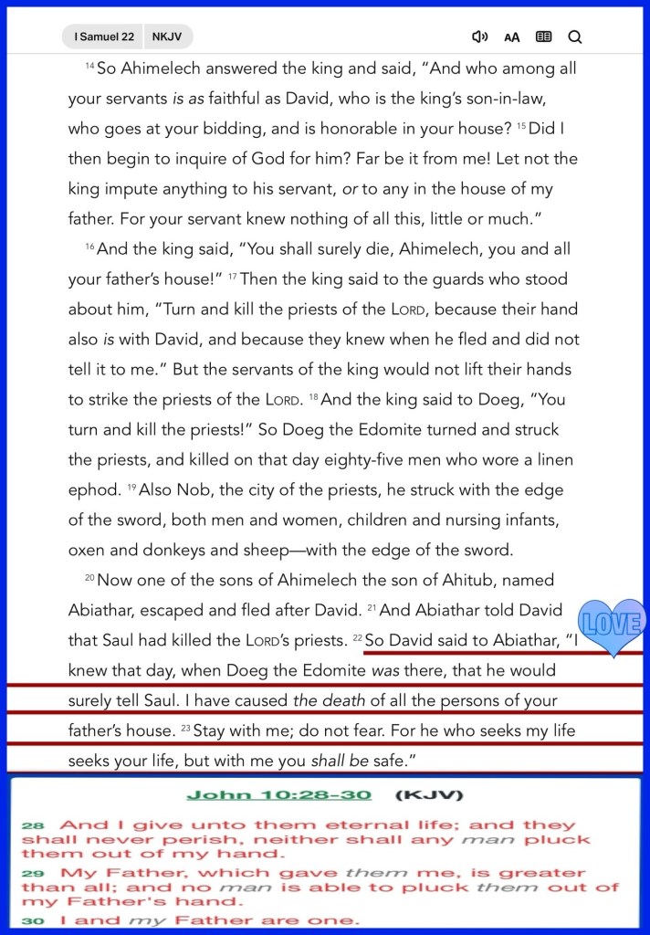 “So David said to Abiathar, “I knew that day, when Doeg the Edomite was there, that he would surely tell Saul. I have caused the death of all the persons of your father’s house. Stay with me; do not fear. For he who seeks my life seeks your life, but with me you shall be safe.”” I Samuel 22:22-23