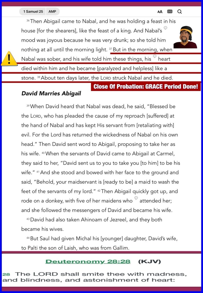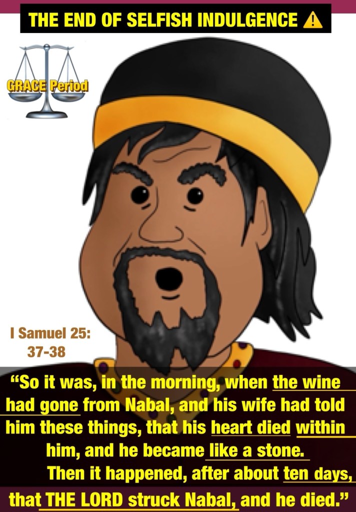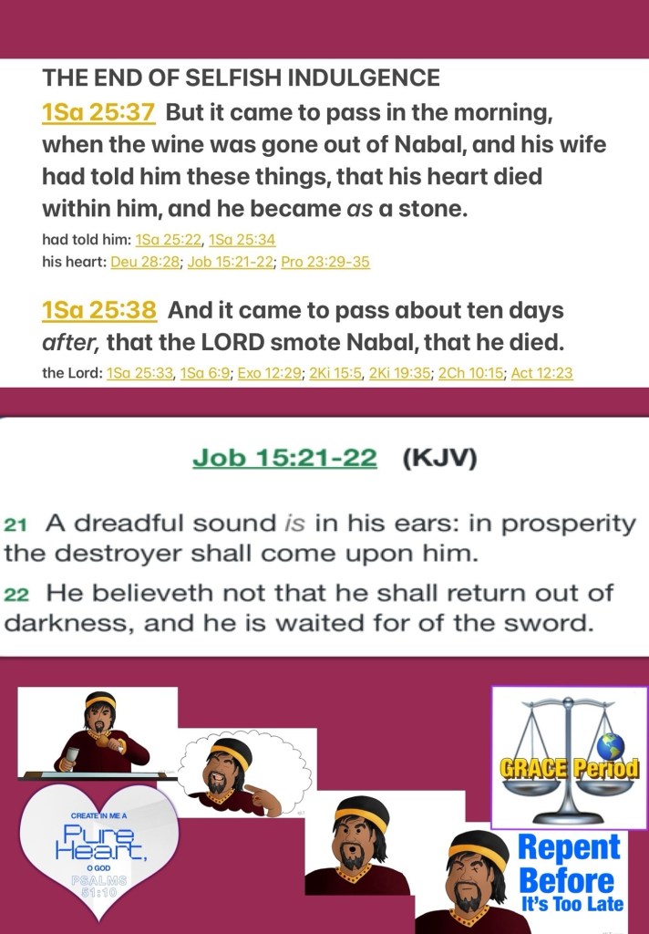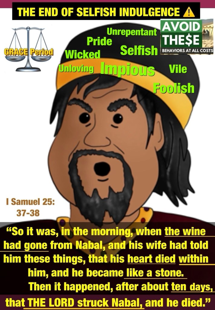 Greetings BeLoved child of THE MOST HIGH GOD! as His children we’re admonished to LOVE LIKE CHRIST: AGAPÈ LOVE: ALL PURPOSE UNSELFISH LAVISHLY Everything GOD Does Is An Over Do: Intentional Excellence and He Has Deposited Some Of That In All of us Thank You JESUS HalleluYAH! We’re Truly Blessed To Be A Blessing so right now as we live during this Probationary Time (The Grace Period) we are to be allowing THE HOLY SET APART SPIRIT: THE RUACH HA’QUODESH to Do The Great Work Of Reforming us, to make ready a people to Present Before THE LIVING GOD. Probation Is Actively Closing All Around us Nothing but What’s Done For YAH shall remain our enemy knows this so his mission steal, kill, destroy before we can Wise Up this is Not the time Spiritual Warfare: Stone Cold Selfishness During The Grace Period sometimes you won’t get a second chance learn the lesson of the life and death of the man named Nabal⚠️ may you Be Blessed by this lesson Thanks for stopping by please note It is always best to humble yourself before GOD has to humble you.