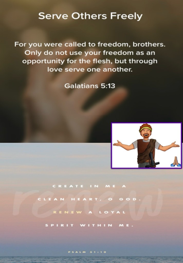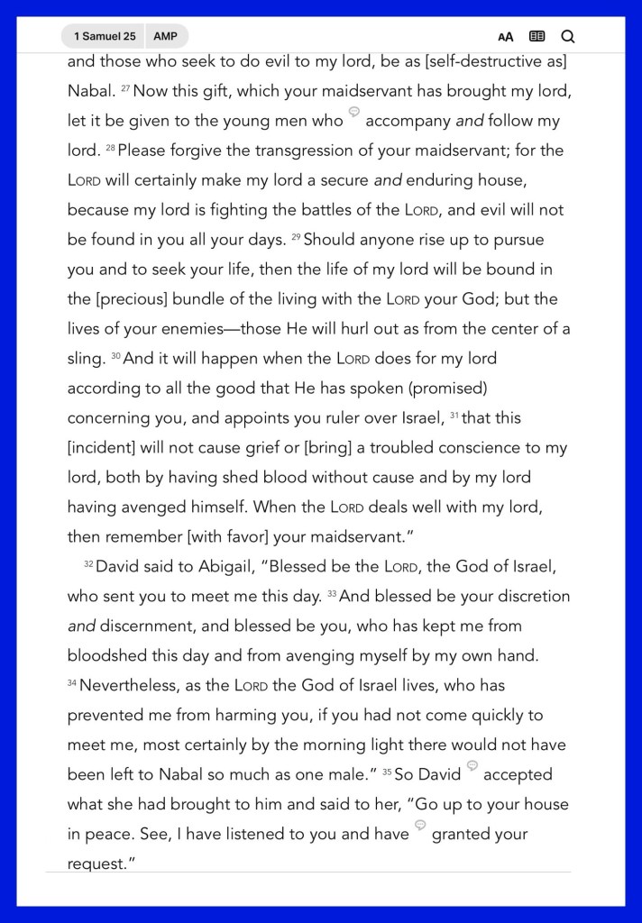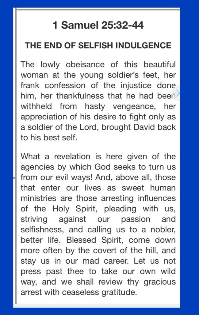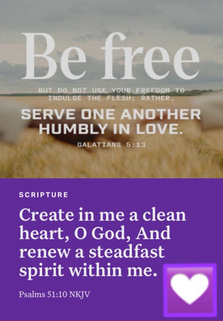 Today’s lesson 1 Samuel 25/31, today’s verses: “For you, brethren, have been called to liberty; only do not use liberty as an opportunity for the flesh, but through love serve one another.” Galatians 5:13 “Create in me a clean heart, O God, And renew a steadfast spirit within me.” Psalms 51:10