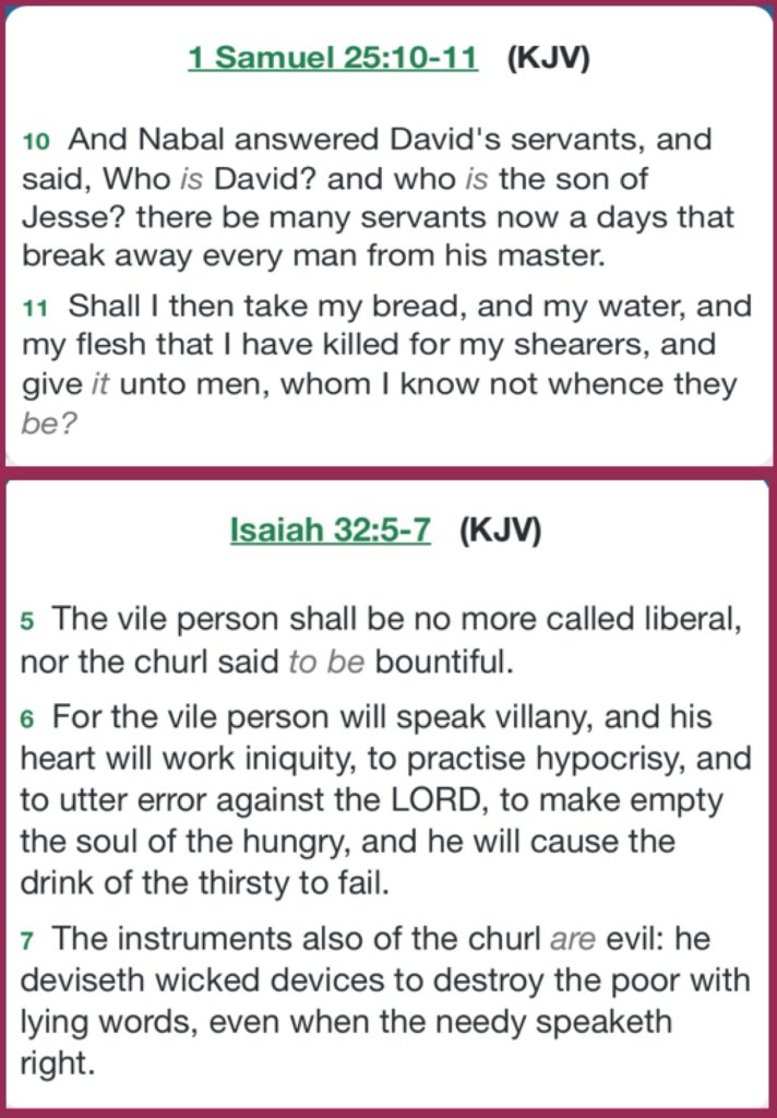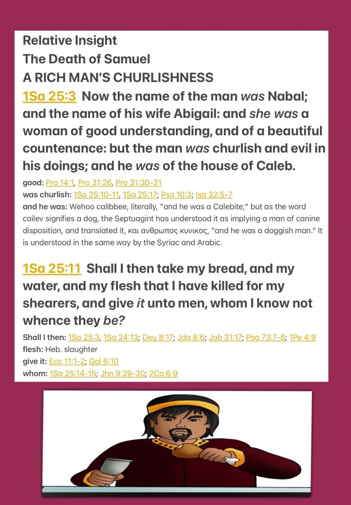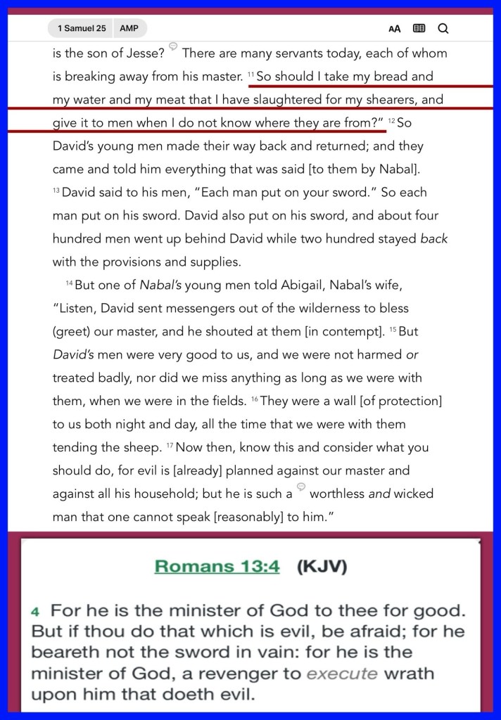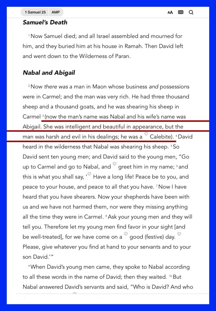 “The name of the man was Nabal, and the name of his wife Abigail. And she was a woman of good understanding and beautiful appearance; but the man was harsh and evil in his doings. He was of the house of Caleb. Shall I then take my bread and my water and my meat that I have killed for my shearers, and give it to men when I do not know where they are from?”” I Samuel 25:3, 11