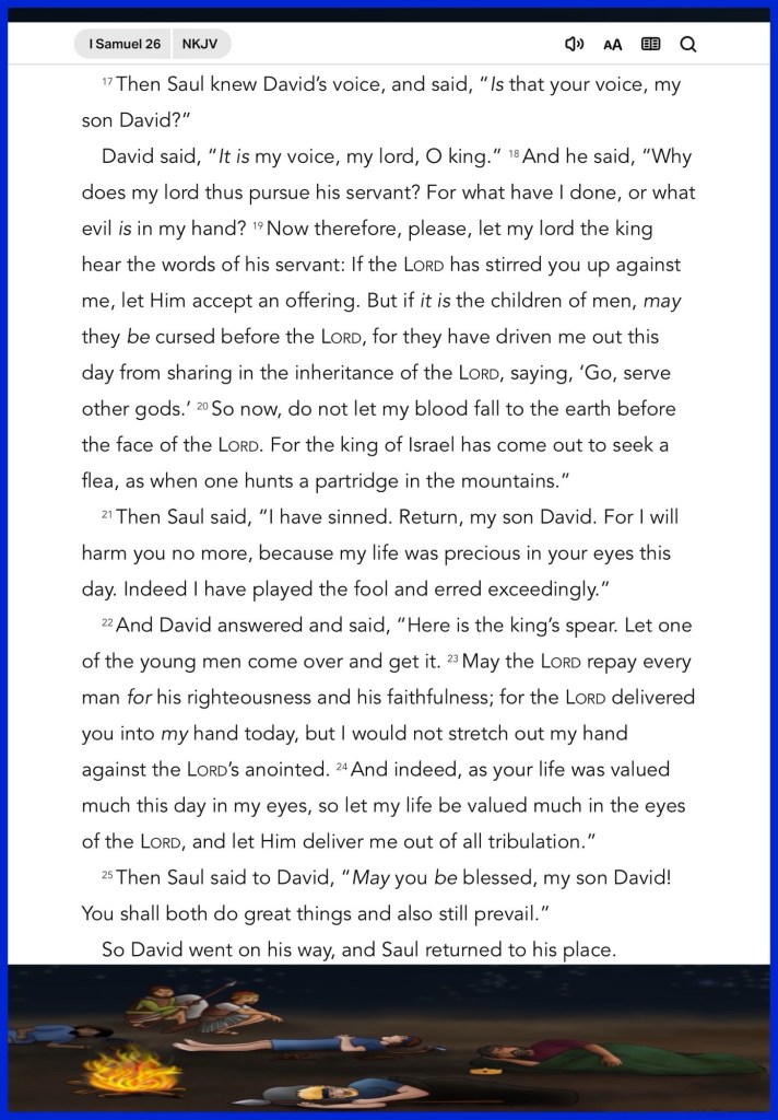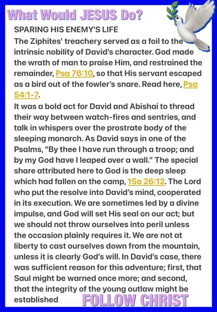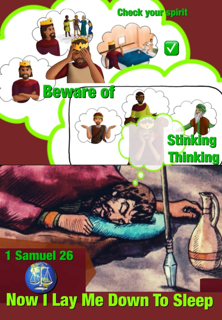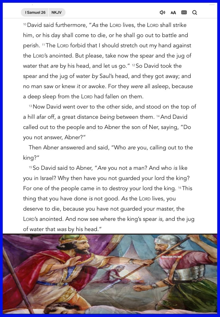 Peace and Blessings BeLoved child Of THE MOST HIGH GOD YAH ELOHIM: better known as GOD THE FATHER, JESUS CHRIST And THE HOLY SPIRIT; THE TRUE AUTHORITIES, WHO AUTHORED LIFE Through THE WORD which His LAWS Of LOVE Hold Together. This basic fact makes everything else make sense HalleluYAH! When your Guide, Guard, Guarantee Is In CHRIST: Directed By THE WORD (The Holy Bible) you can be certain and your steps sure that you’re Walking In Love HalleluYAH! In today’s episode David is confronted Again with the opportunity to literally Take Out his enemy But David understood a crucial fact: “who can stretch out his hand against the Lord’s anointed, and be guiltless?” There’s No blessing in ill gotten gain; YAH in no way Instructed him to “kill Saul”, GOD Never Usurps our Free Will so he certainly could have acted on his stress / frustration and felt justified in taking the life of one who was constantly preying on his life (self defense right? Wrong) as children of GOD CHRIST Is The Standard Model what He Would Do (WWJD), GOD Will Deal with everyone called by His Name First more over He Has Promised Vengeance Is Mine, I Will Repay at times people who do us wrong never seem to be dealt with I believe it’s in those moments: The Grace Period of Probation YAH Is hardest to Save our souls. Remember those swept away in Noah’s day, Lot’s wife, Nabal, now Saul; these Spiritual Warfare Tests: Will You Honor THE WORD Of YAH or go your own way?